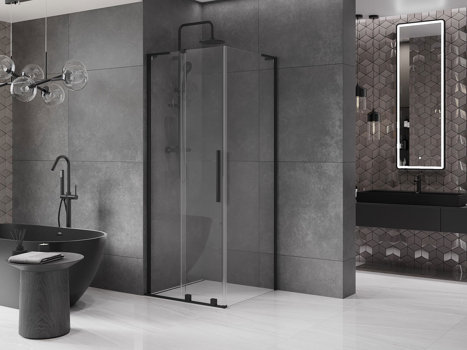 Het handige en comfortabele handvat is gemaakt van roestvrij staal. De modieuze vorm in combinatie met de afwerking die is afgestemd op de kleur van de profielen geeft het geheel een moderne en stijlvolle uitstraling, en benadrukt de esthetiek van elke badkamer.