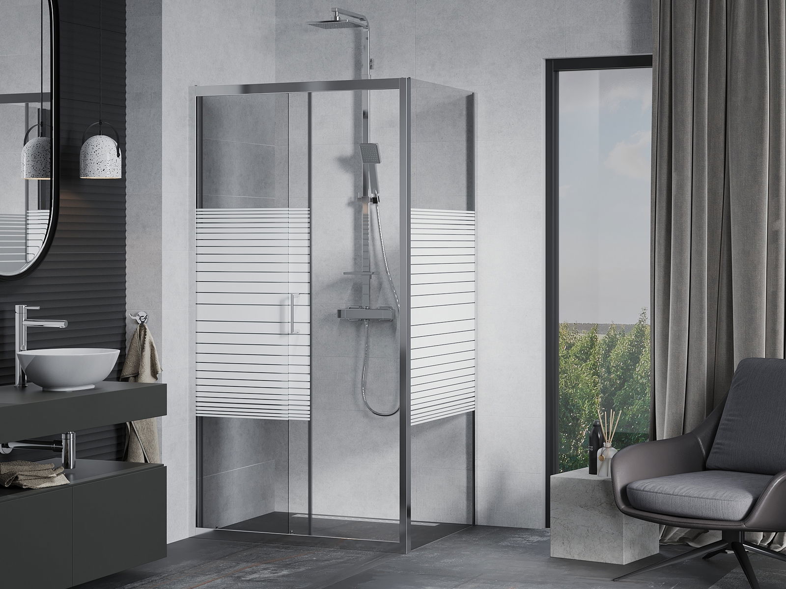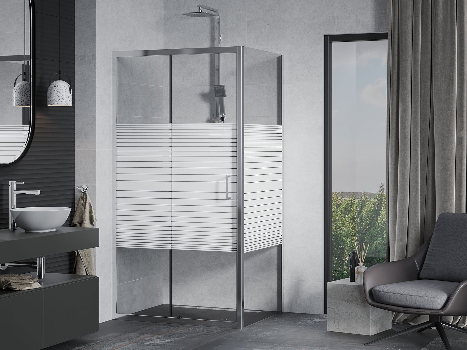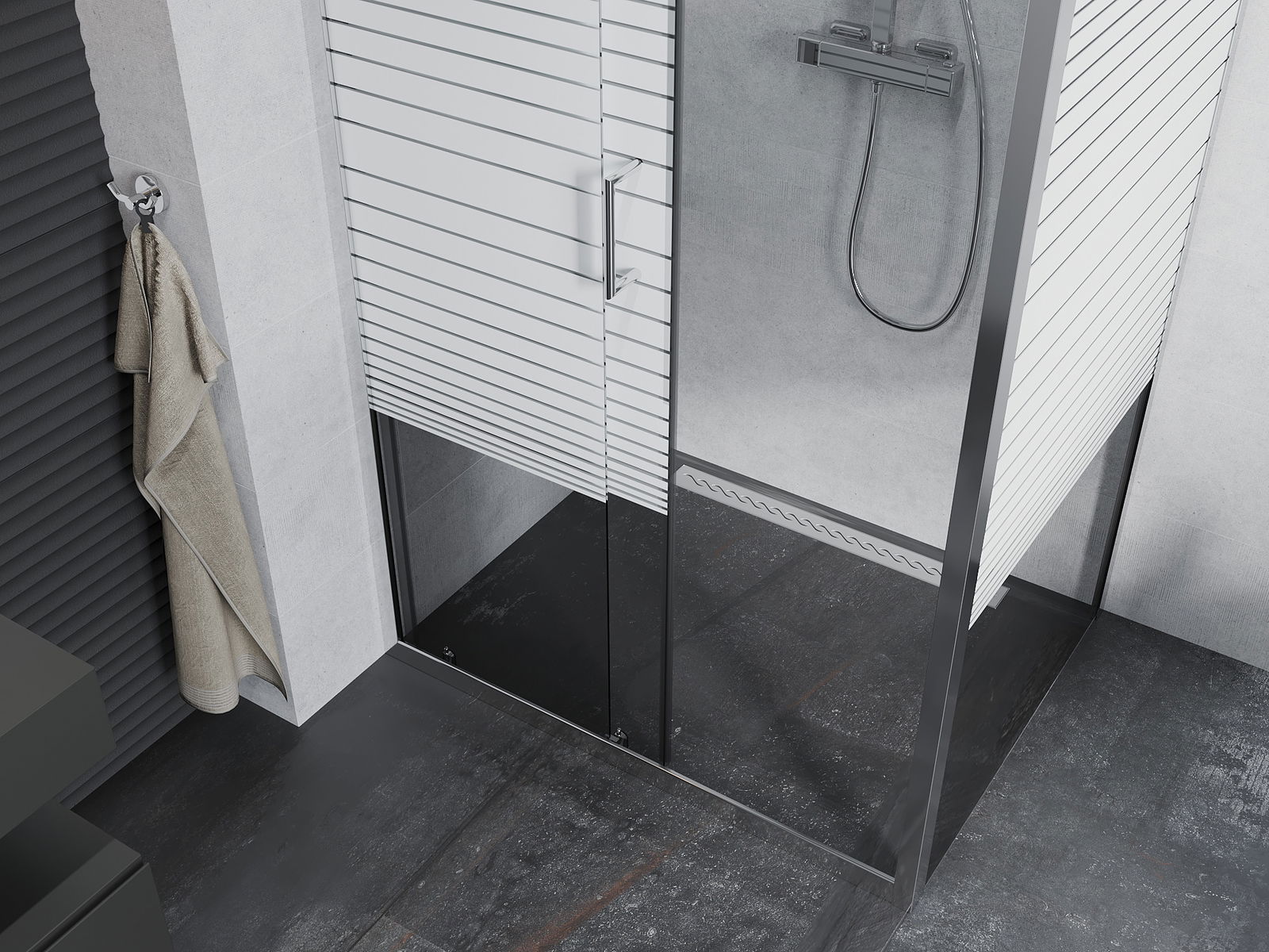 Handige en comfortabele greep is gemaakt van duurzaam en weerbestendig metaal. De modieuze vorm in combinatie met een afwerking die past bij de kleur van de profielen geeft het geheel een moderne en stijlvolle uitstraling, wat de esthetiek van elke badkamer benadrukt.