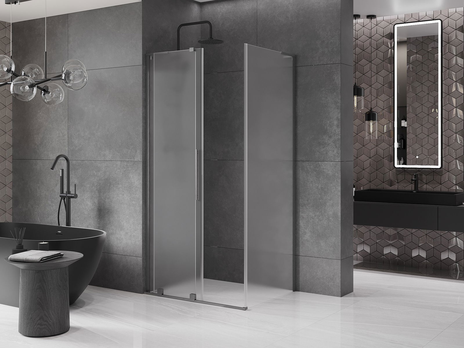 Het handige en comfortabele handvat is gemaakt van roestvrij staal. De modieuze vorm in combinatie met de afwerking die is afgestemd op de kleur van de profielen geeft het geheel een moderne en stijlvolle uitstraling, en benadrukt de esthetiek van elke badkamer.