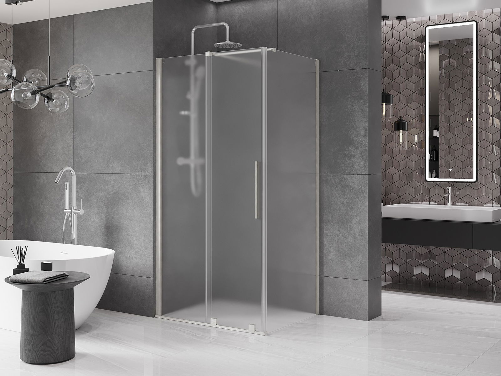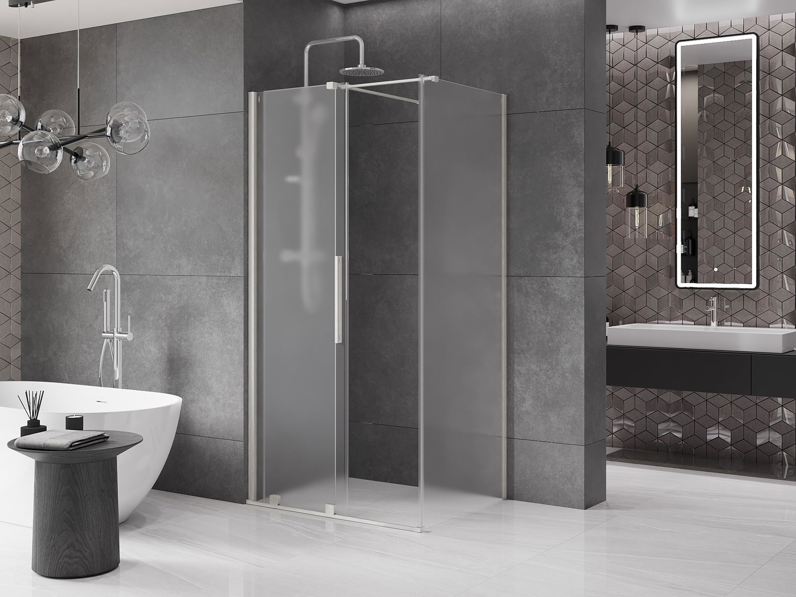 Het handige en comfortabele handvat is gemaakt van roestvrij staal. De modieuze vorm in combinatie met de afwerking die is afgestemd op de kleur van de profielen geeft het geheel een moderne en stijlvolle uitstraling, en benadrukt de esthetiek van elke badkamer.