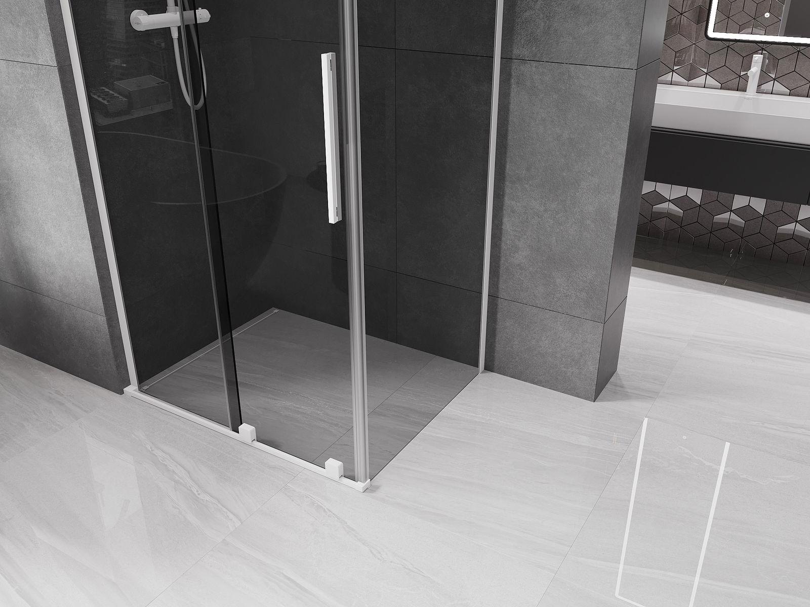 Het handige en comfortabele handvat is gemaakt van roestvrij staal. De modieuze vorm in combinatie met de afwerking die is afgestemd op de kleur van de profielen geeft het geheel een moderne en stijlvolle uitstraling, en benadrukt de esthetiek van elke badkamer.