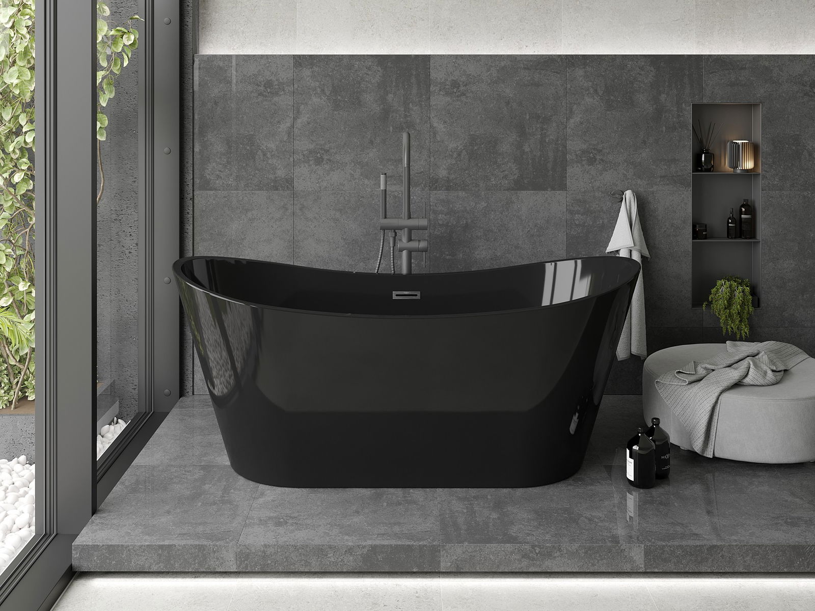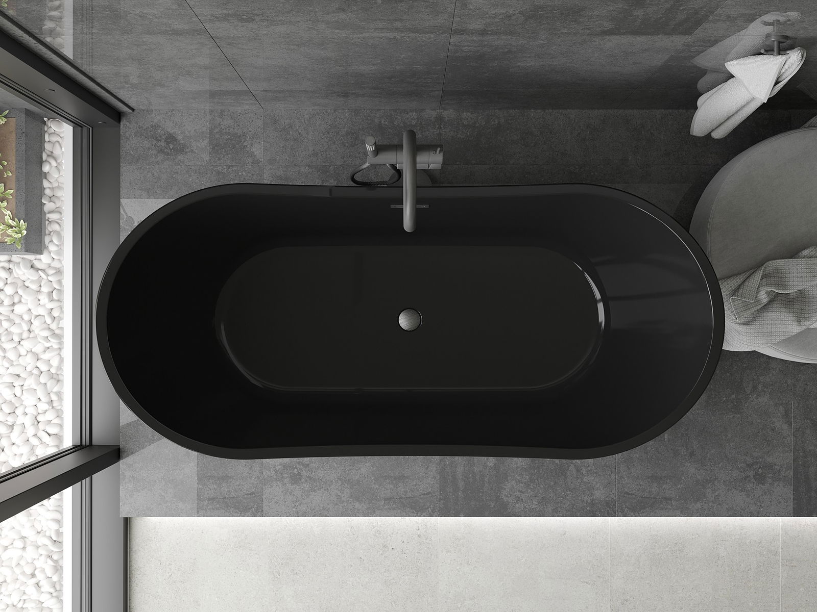 De vrijstaande badkuip met afmetingen 170 x 80 cm is een ideale oplossing voor een moderne badkamer. Gemaakt van sanitair acryl, biedt het een hoge weerstand tegen dofheid en UV-straling. De elegante zwarte kleur gecombineerd met de geborstelde gun grijze afwerking geeft een unieke uitstraling. De ovale vorm en vrijstaande installatie zorgen voor eenvoudige installatie, en het overloopgat verhoogt de functionaliteit.
