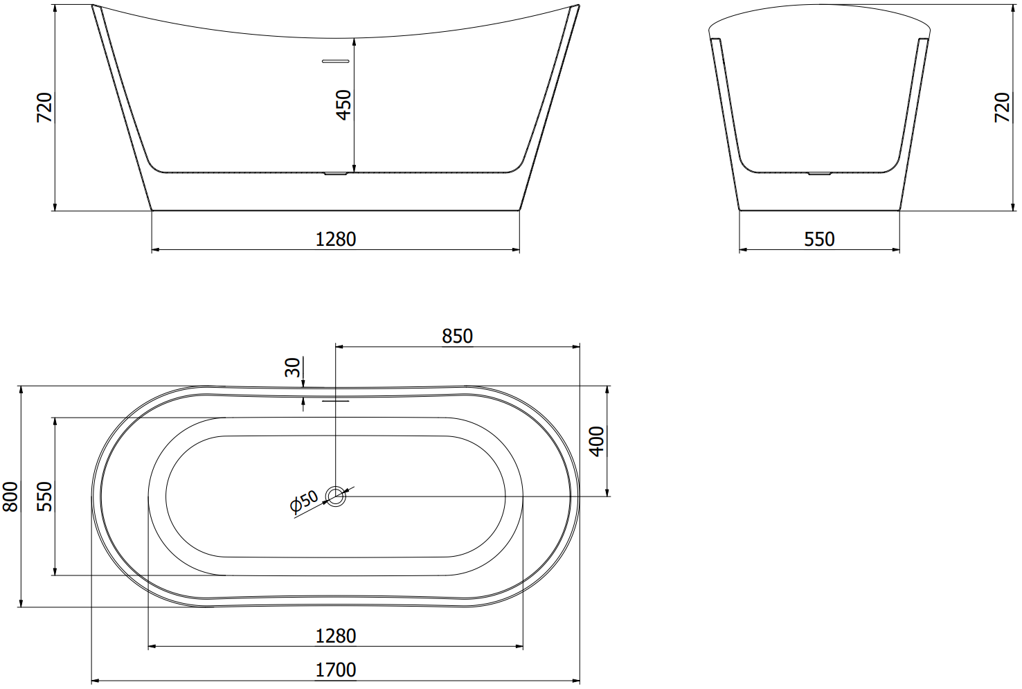 Mexen Montana vrijstaande badkuip 170 x 80 cm, zwart, zwarte overloop - 52011708070-70