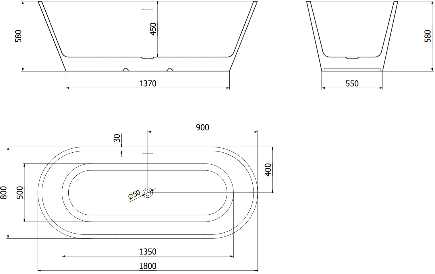 Mexen Luna vrijstaande badkuip 180 x 80 cm, wit/zwart, zwarte overloop - 52031808075-70