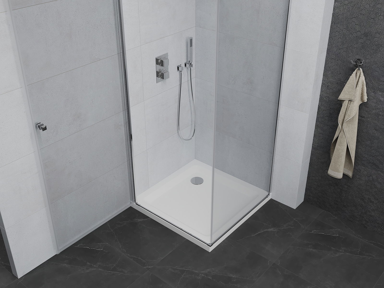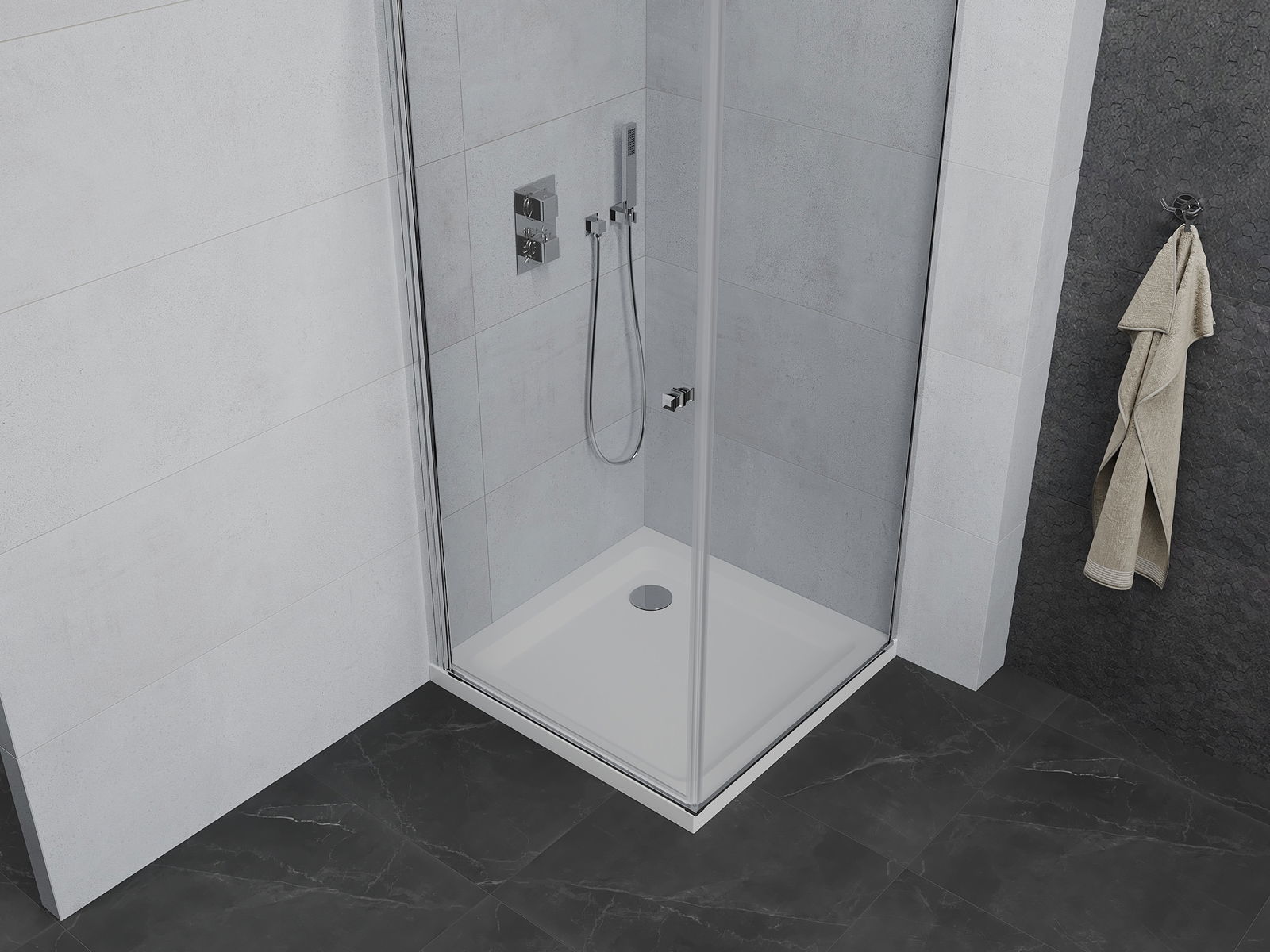 Handige en comfortabele greep is gemaakt van duurzaam en weerbestendig metaal. De modieuze vorm in combinatie met een afwerking die past bij de kleur van de profielen geeft het geheel een moderne en stijlvolle uitstraling, wat de esthetiek van elke badkamer benadrukt.