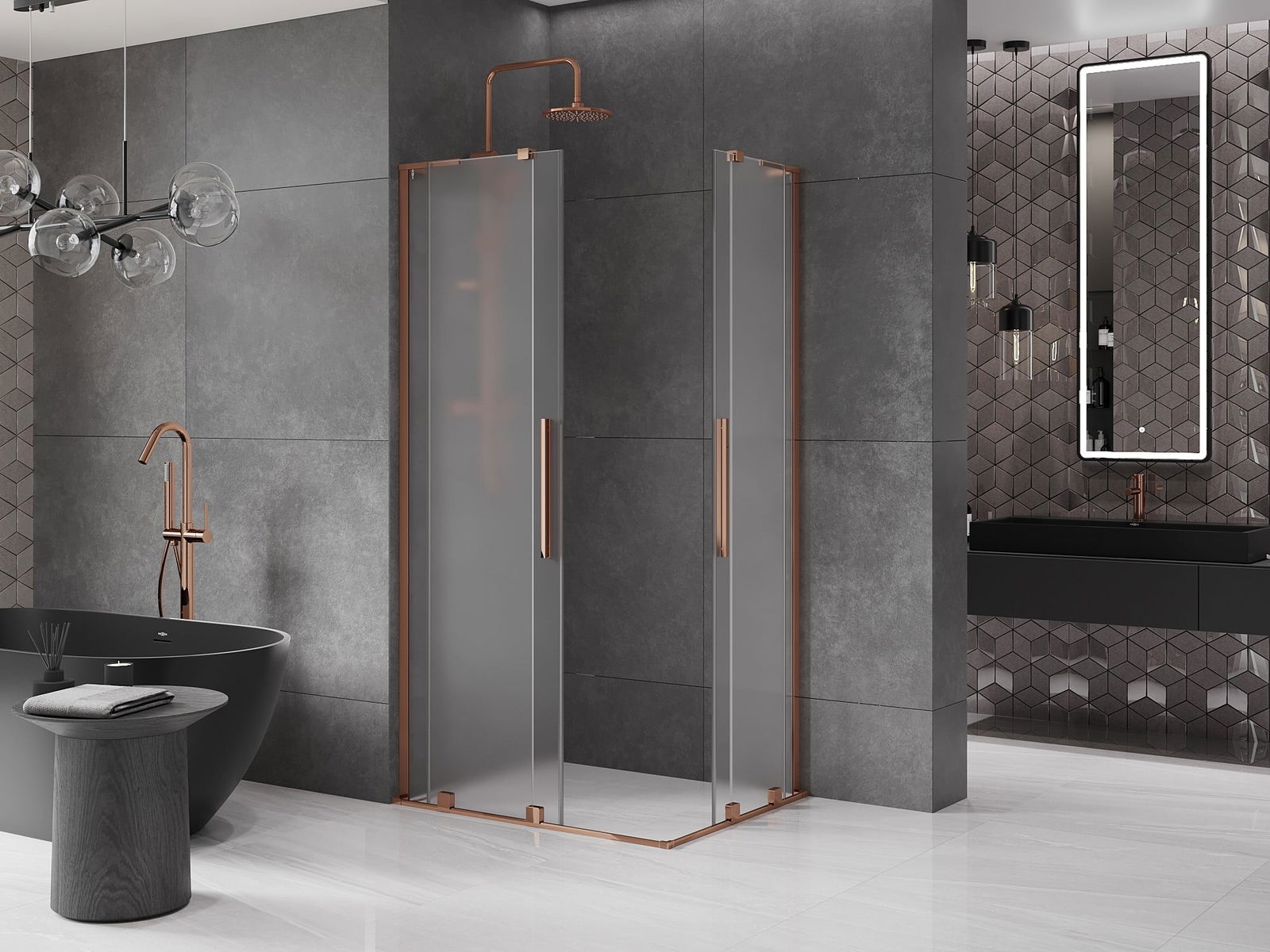 Het handige en comfortabele handvat is gemaakt van roestvrij staal. De modieuze vorm in combinatie met de afwerking die is afgestemd op de kleur van de profielen geeft het geheel een moderne en stijlvolle uitstraling, en benadrukt de esthetiek van elke badkamer.