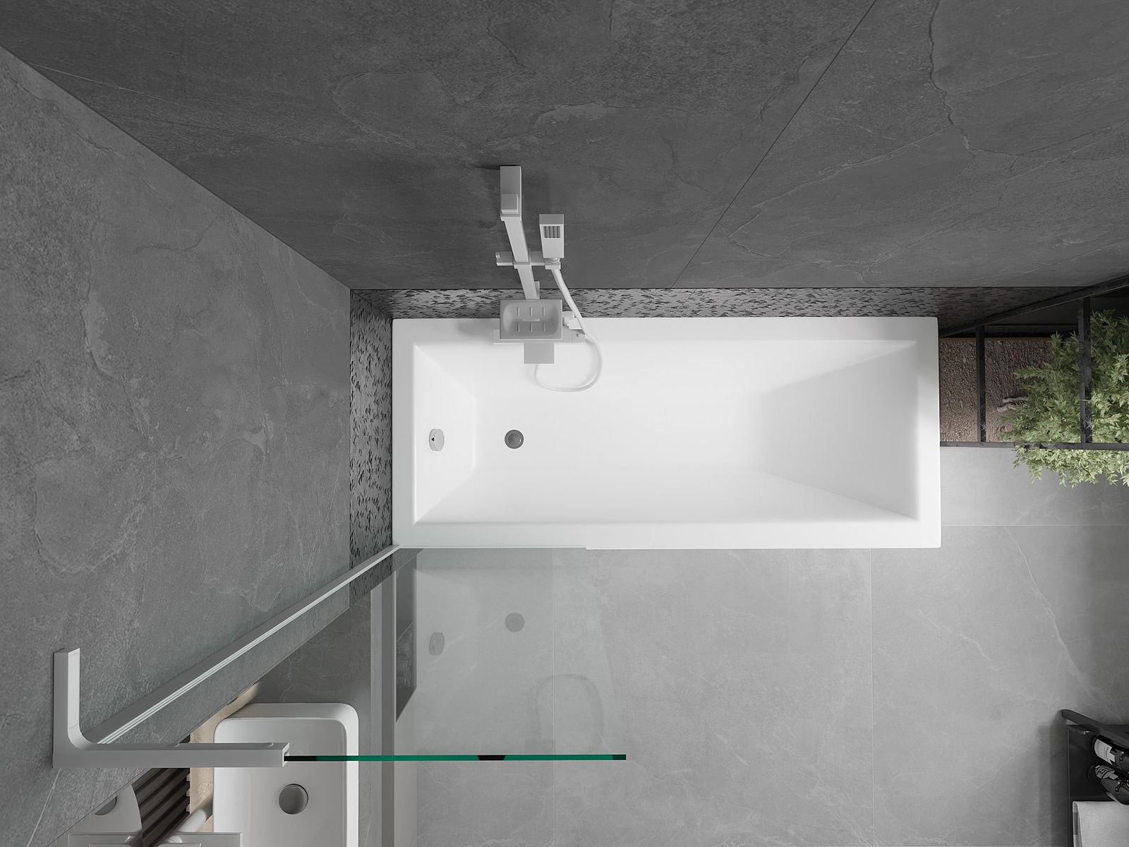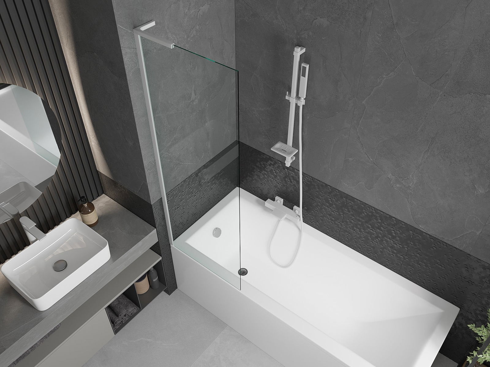 Dankzij het gebruik van een universeel montagesysteem kan het scherm aan de rechter- of linkerkant worden gemonteerd, afhankelijk van de behoeften. Op deze manier kunt u eenvoudig een douche ontwerpen die is aangepast aan de ruimte van de badkamer.