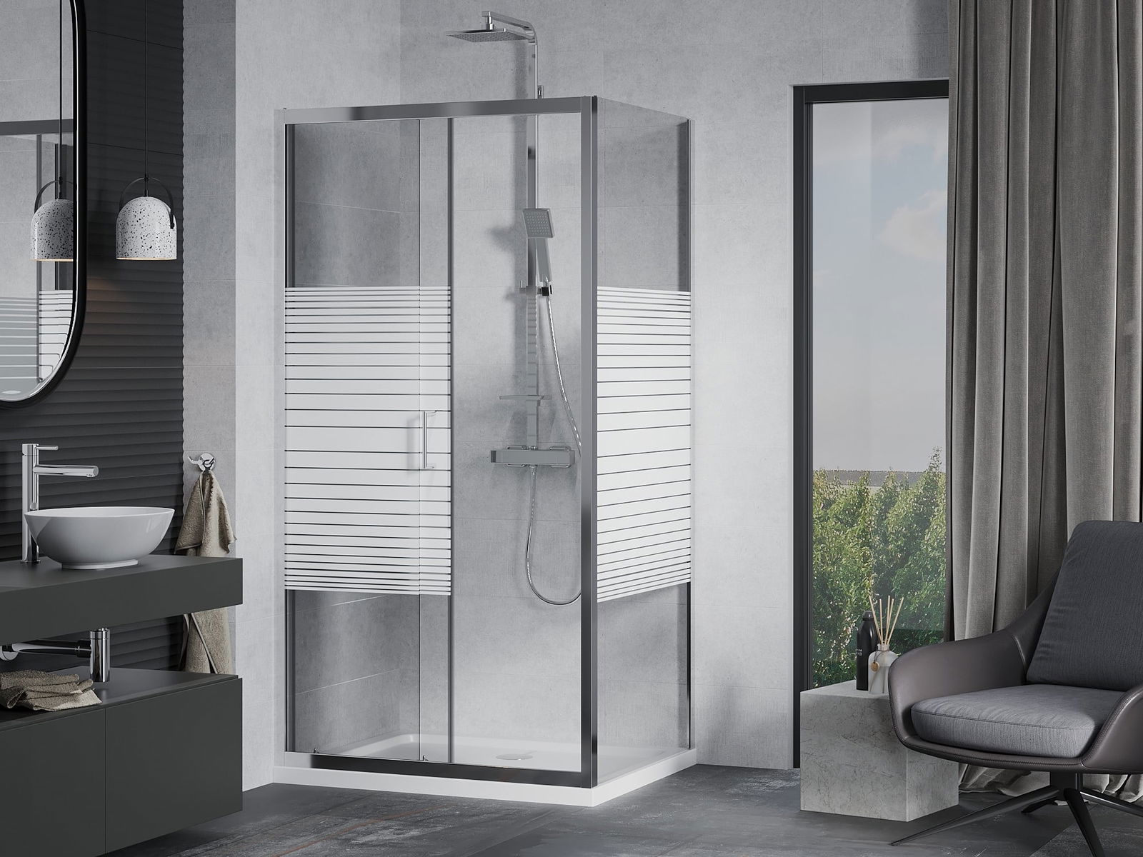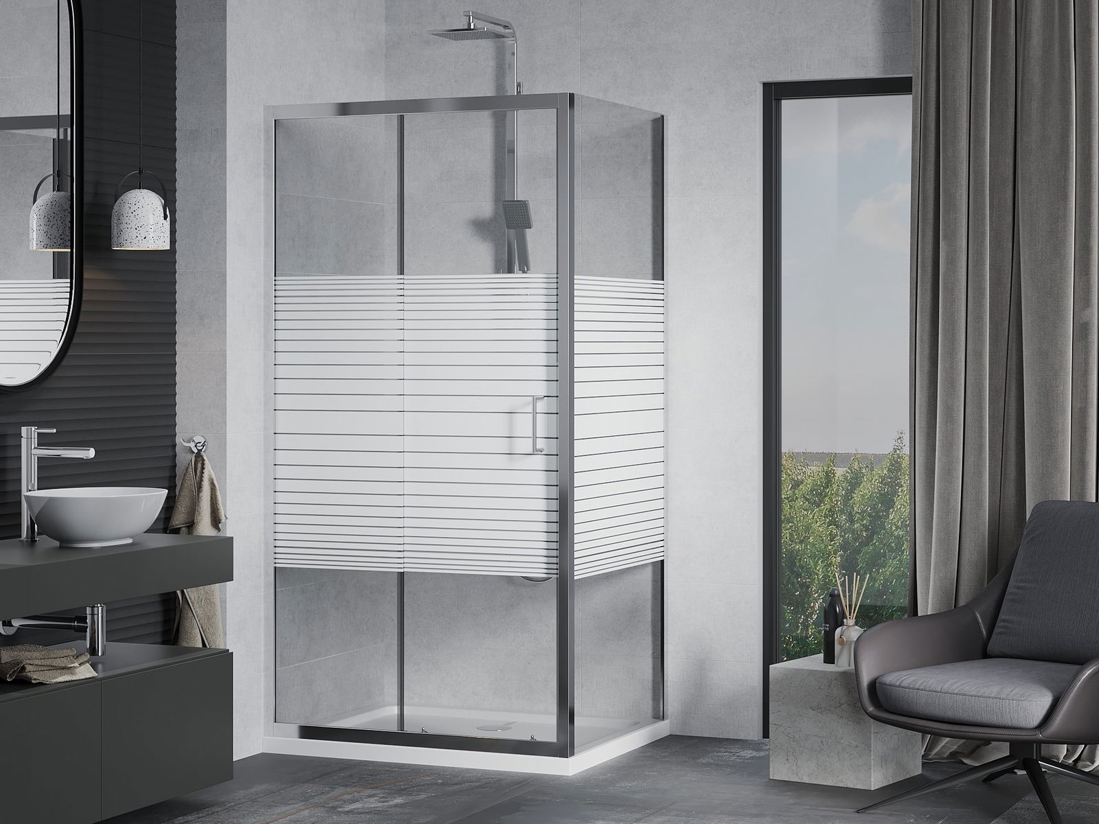Handige en comfortabele greep is gemaakt van duurzaam en weerbestendig metaal. De modieuze vorm in combinatie met een afwerking die past bij de kleur van de profielen geeft het geheel een moderne en stijlvolle uitstraling, wat de esthetiek van elke badkamer benadrukt.
