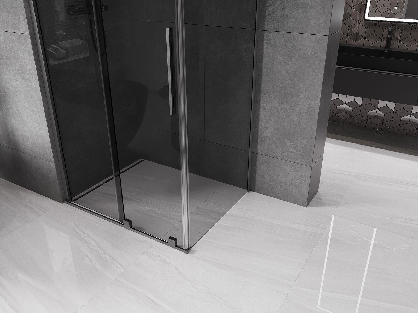 Het handige en comfortabele handvat is gemaakt van roestvrij staal. De modieuze vorm in combinatie met de afwerking die is afgestemd op de kleur van de profielen geeft het geheel een moderne en stijlvolle uitstraling, en benadrukt de esthetiek van elke badkamer.
