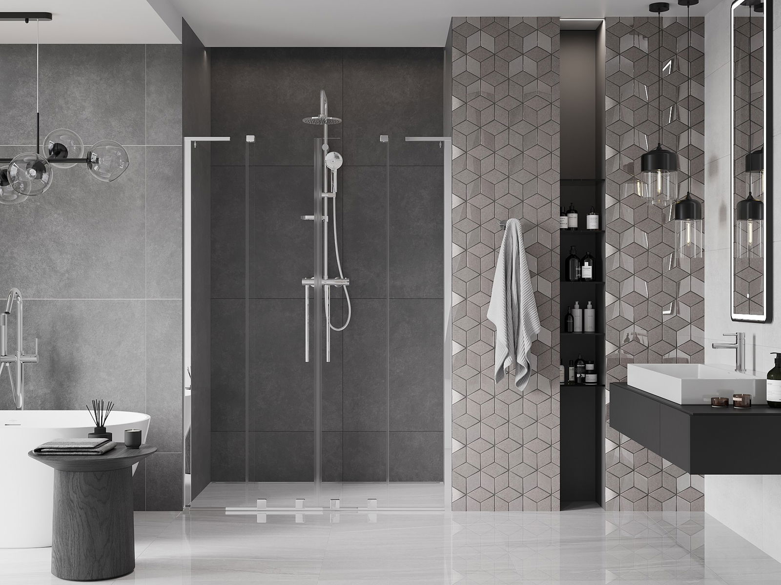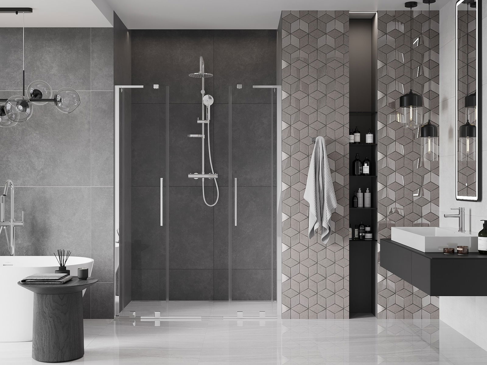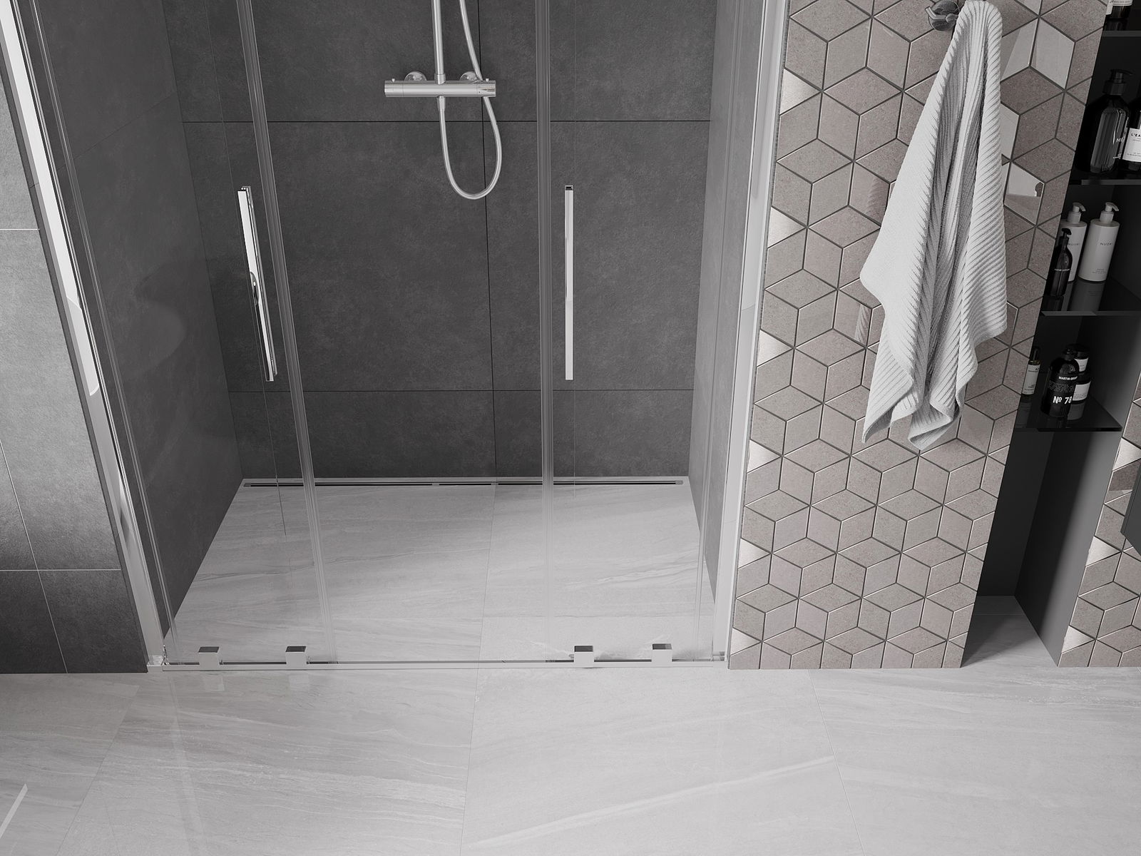Het handige en comfortabele handvat is gemaakt van roestvrij staal. De modieuze vorm in combinatie met de afwerking die is afgestemd op de kleur van de profielen geeft het geheel een moderne en stijlvolle uitstraling, en benadrukt de esthetiek van elke badkamer.