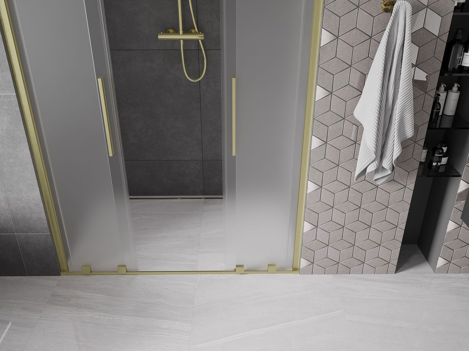 Het handige en comfortabele handvat is gemaakt van roestvrij staal. De modieuze vorm in combinatie met de afwerking die is afgestemd op de kleur van de profielen geeft het geheel een moderne en stijlvolle uitstraling, en benadrukt de esthetiek van elke badkamer.