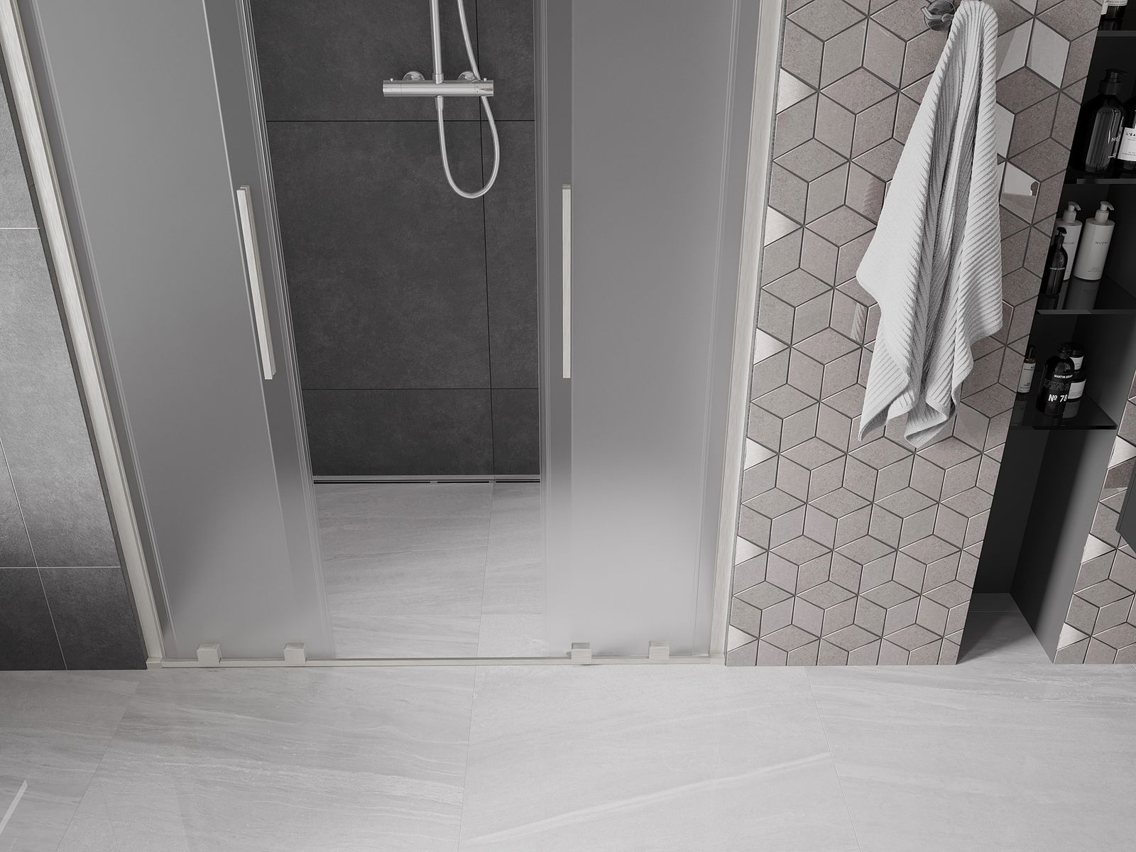 Het handige en comfortabele handvat is gemaakt van roestvrij staal. De modieuze vorm in combinatie met de afwerking die is afgestemd op de kleur van de profielen geeft het geheel een moderne en stijlvolle uitstraling, en benadrukt de esthetiek van elke badkamer.