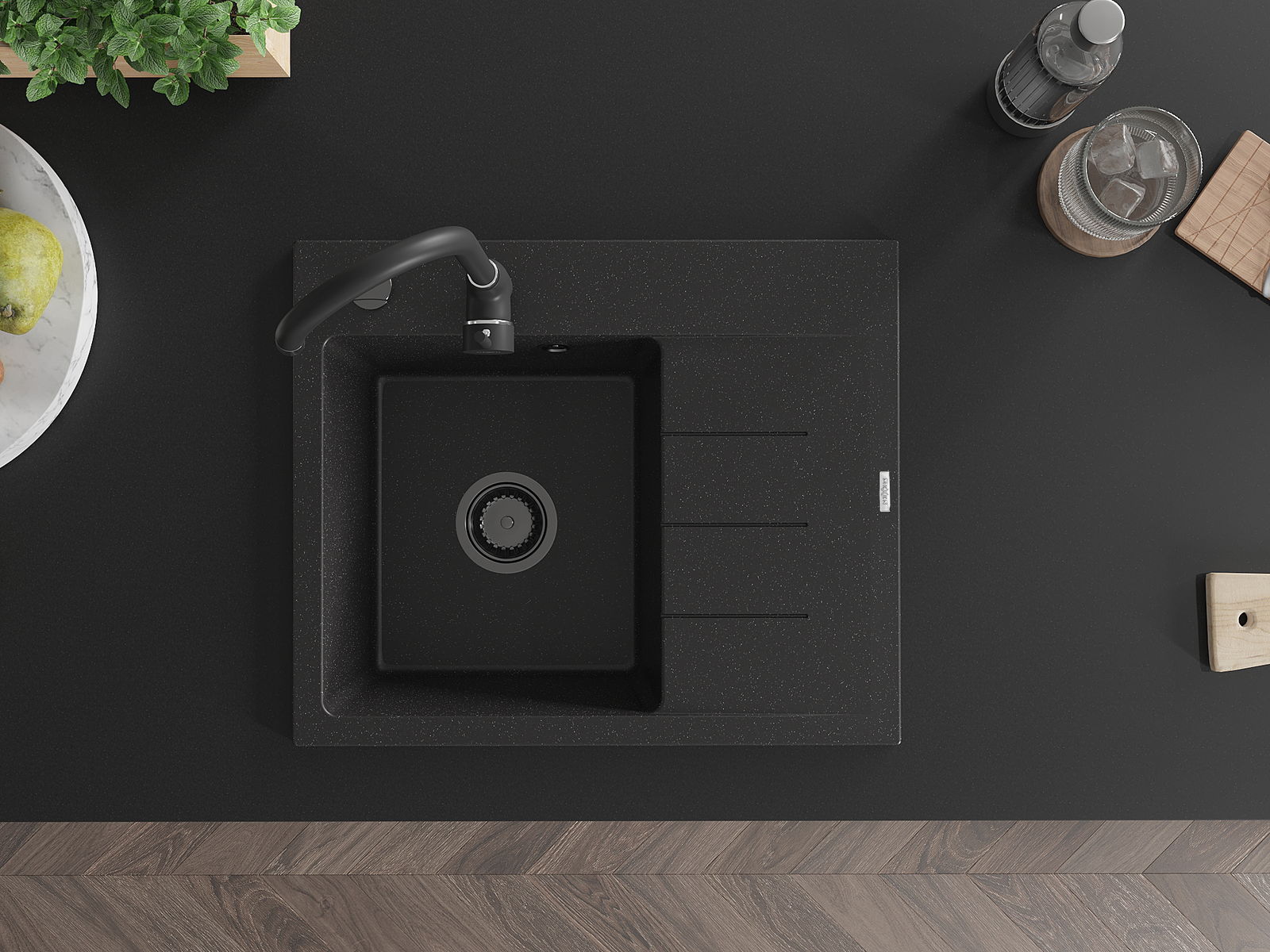 Mexen Ben 1-vaks granieten spoelbak met afdruiprek, links 600 x 500 mm zwart/zilveren metallic met zwarte sifon