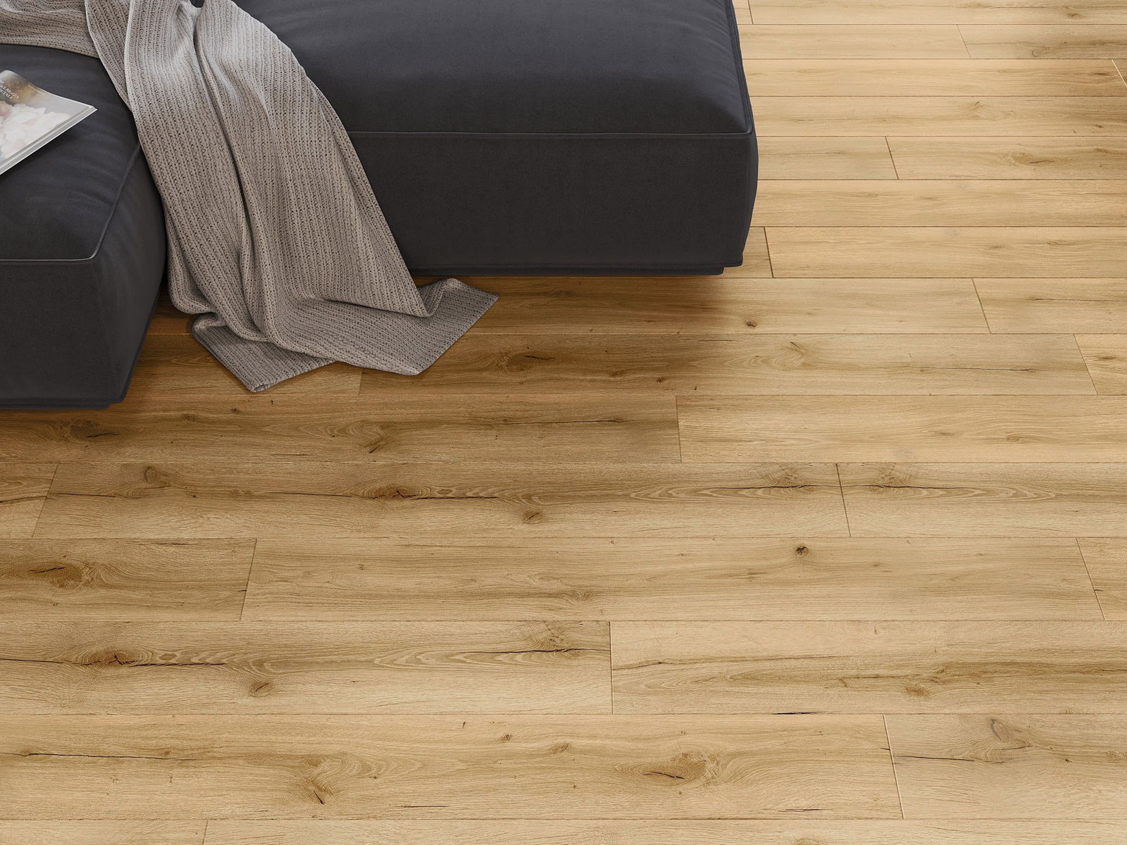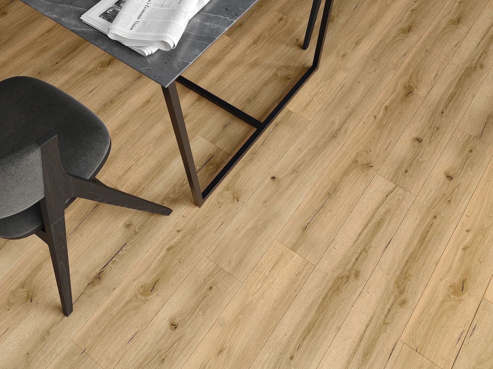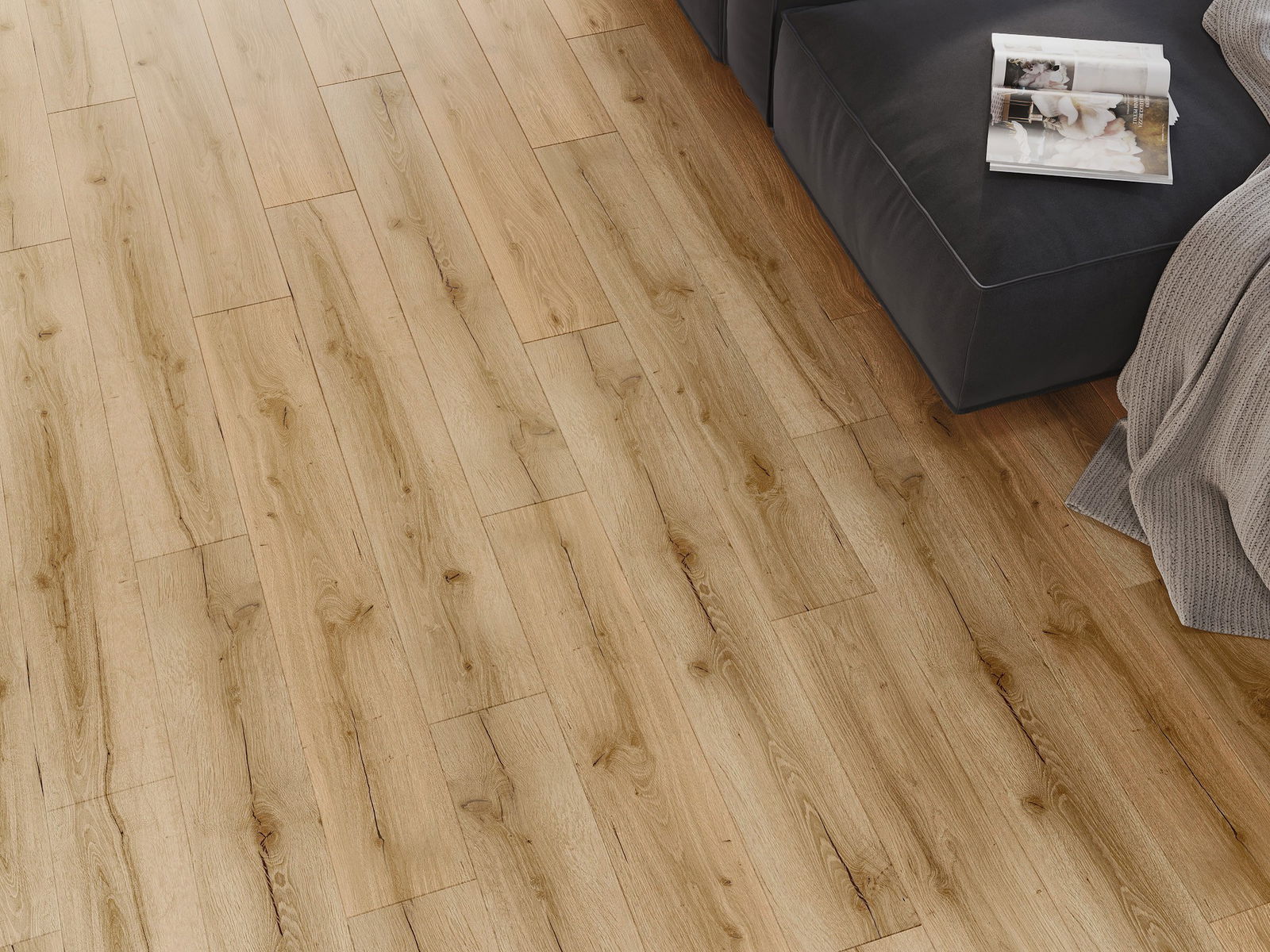 De panelen hebben een 4-zijdige voeg - elke zijde is zo gefreesd dat er bij het leggen een V-vormige verbinding ontstaat. Dit design geeft de vloer een duidelijkere structuur, waardoor het diepte en een esthetisch karakter krijgt. Dit effect wordt vooral gewaardeerd in moderne interieurs, waar details de unieke uitstraling van het interieur benadrukken.
