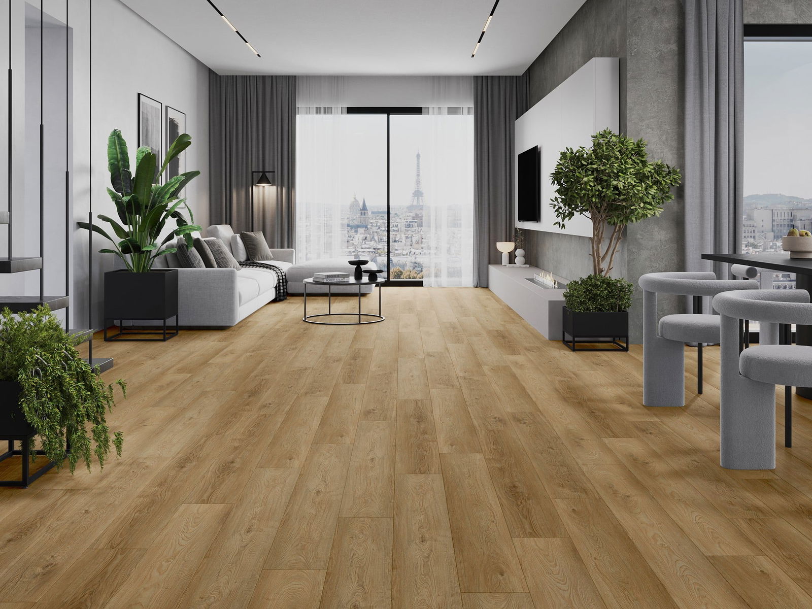 De panelen hebben een 4-zijdige voeg - elke zijde is zo gefreesd dat er bij het leggen een V-vormige verbinding ontstaat. Dit design geeft de vloer een duidelijkere structuur, waardoor het diepte en een esthetisch karakter krijgt. Dit effect wordt vooral gewaardeerd in moderne interieurs, waar details de unieke uitstraling van het interieur benadrukken.