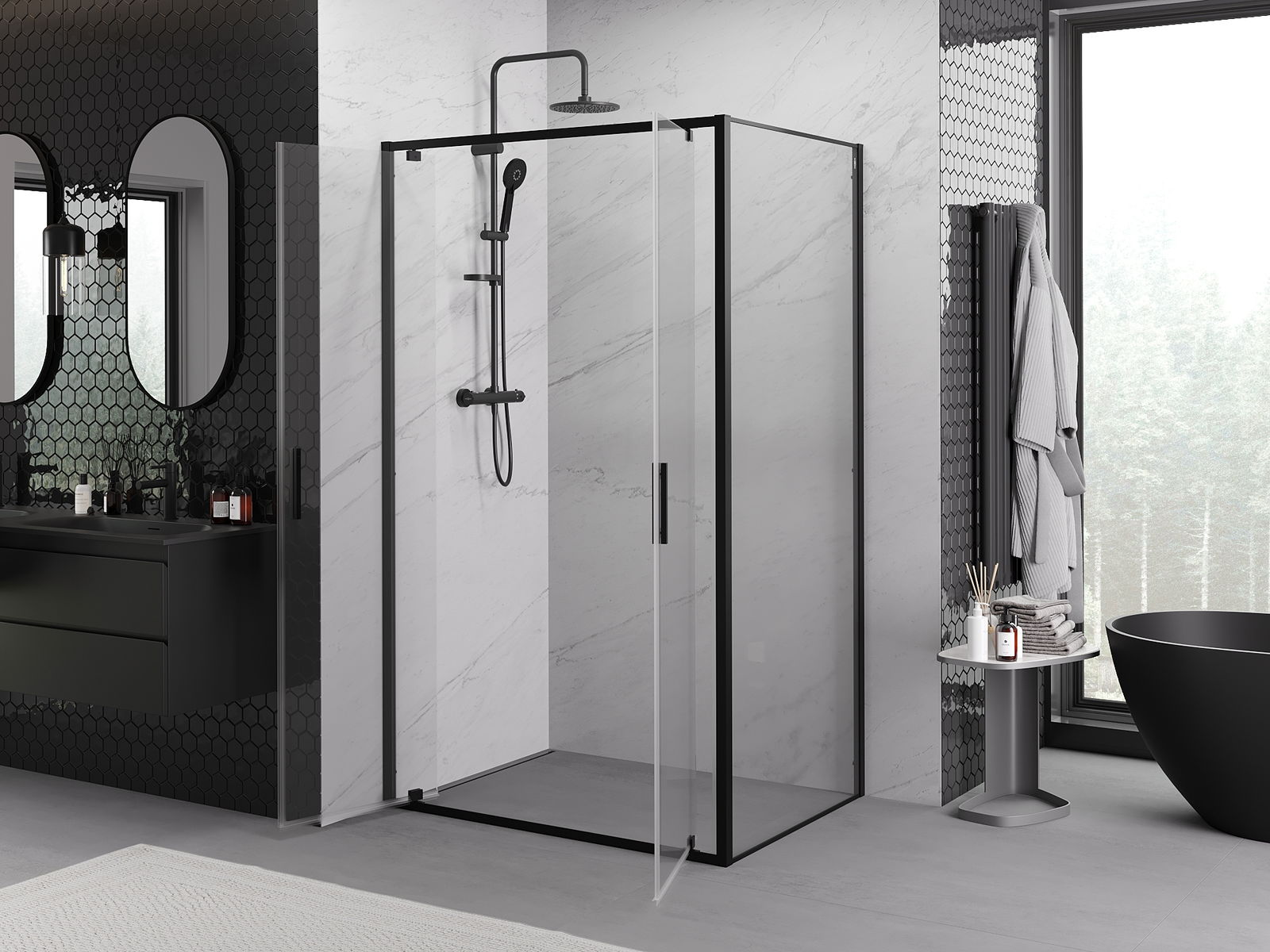 Draaideuren bieden maximale vrijheid tijdens het gebruik. Ze hebben stevige scharnieren gemaakt van duurzaam materiaal, die gemakkelijk schoon te houden zijn en zorgen voor gemakkelijke toegang tot het interieur van de cabine.