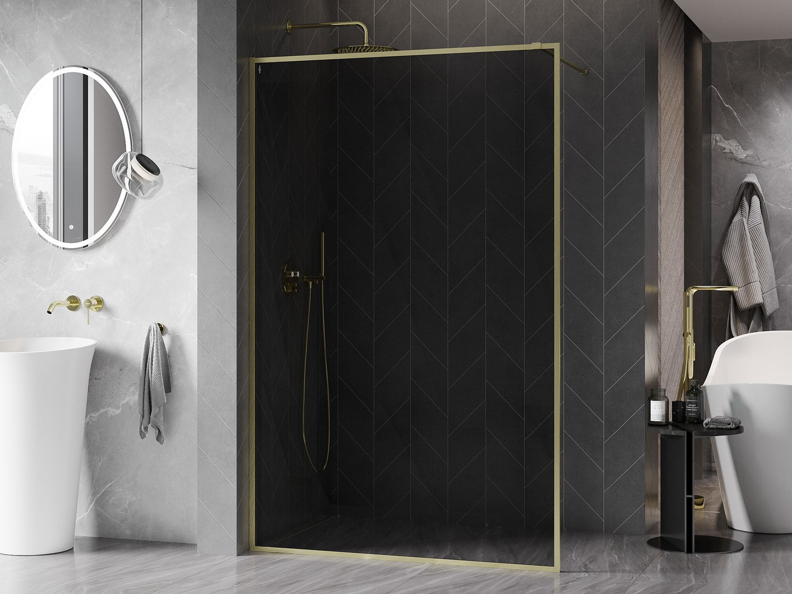 Mexen Kioto-F douchewand Walk-in met frame 90 x 202 cm, grafiet 8 mm, goud geborsteld - 800-090-104-55-40