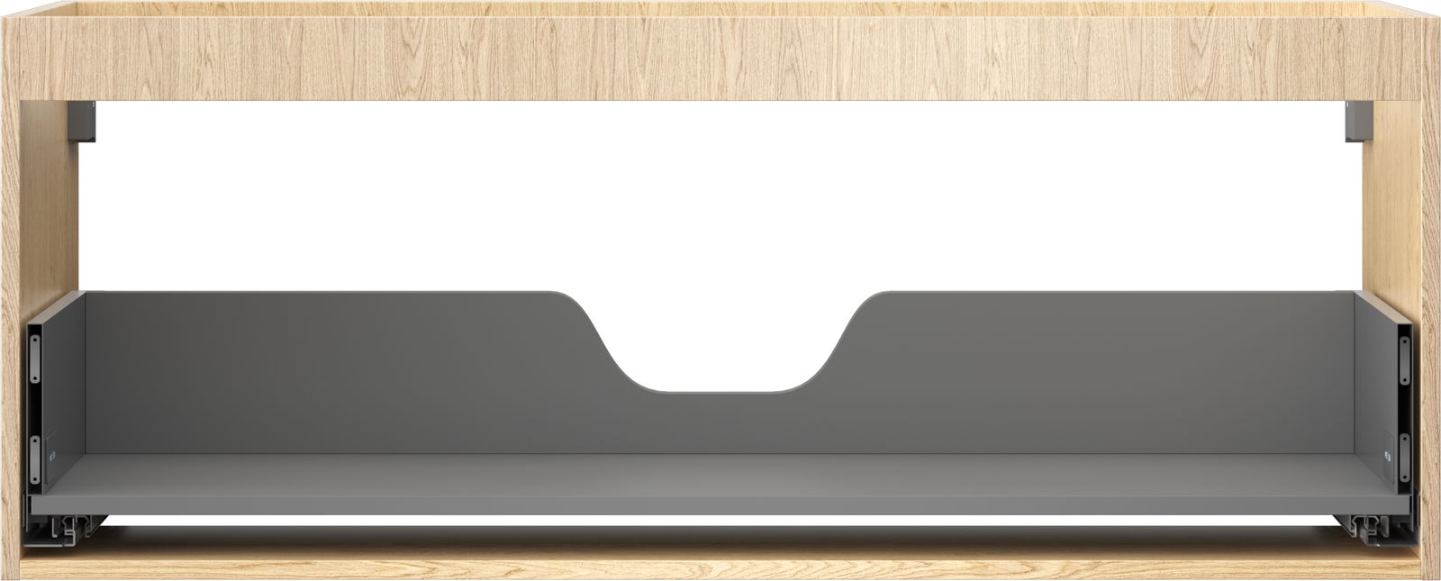 De uitsparing in de lade is ontworpen voor de sifon, die essentieel is bij het installeren van wastafels. Hierdoor kan de unit volledig functioneel worden geïnstalleerd zonder dat er laderuimte hoeft te worden opgeofferd.