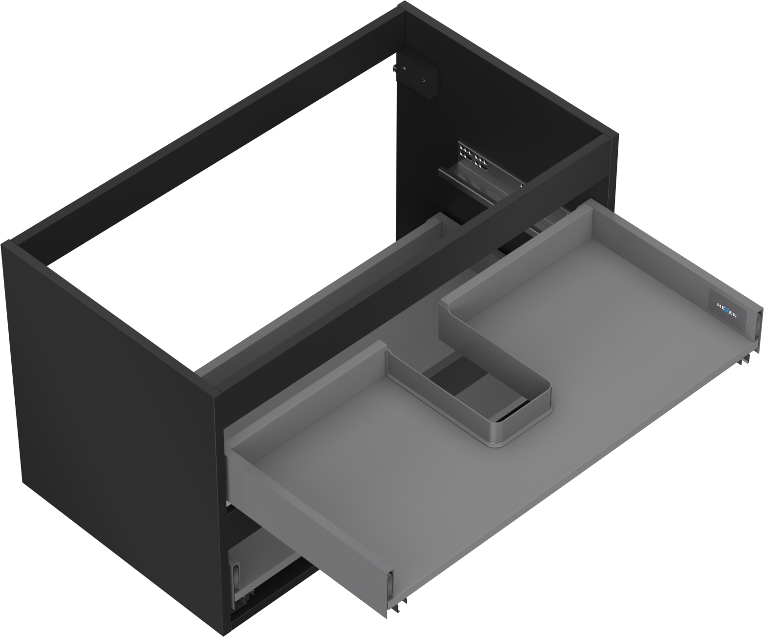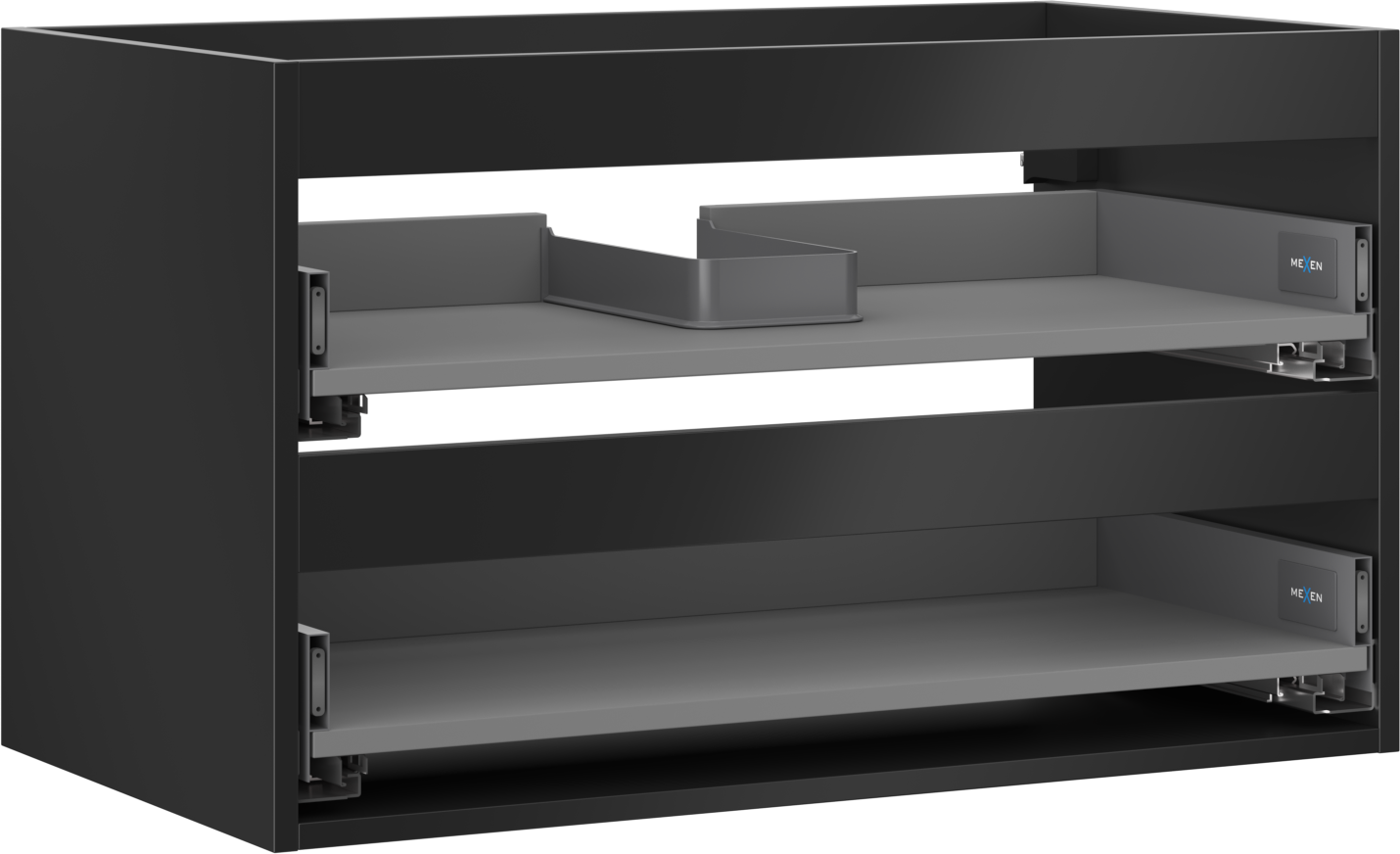 De uitsparing in de lade is zo ontworpen dat het de sifon kan bevatten, die noodzakelijk is in wastafelinstallaties. Hierdoor kan het meubel volledig functioneel worden gemonteerd, zonder dat er ruimte in de lade opgeofferd hoeft te worden voor installatiedoeleinden.