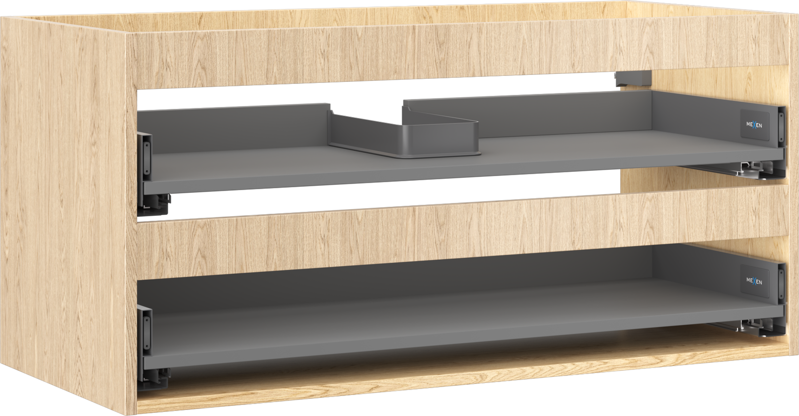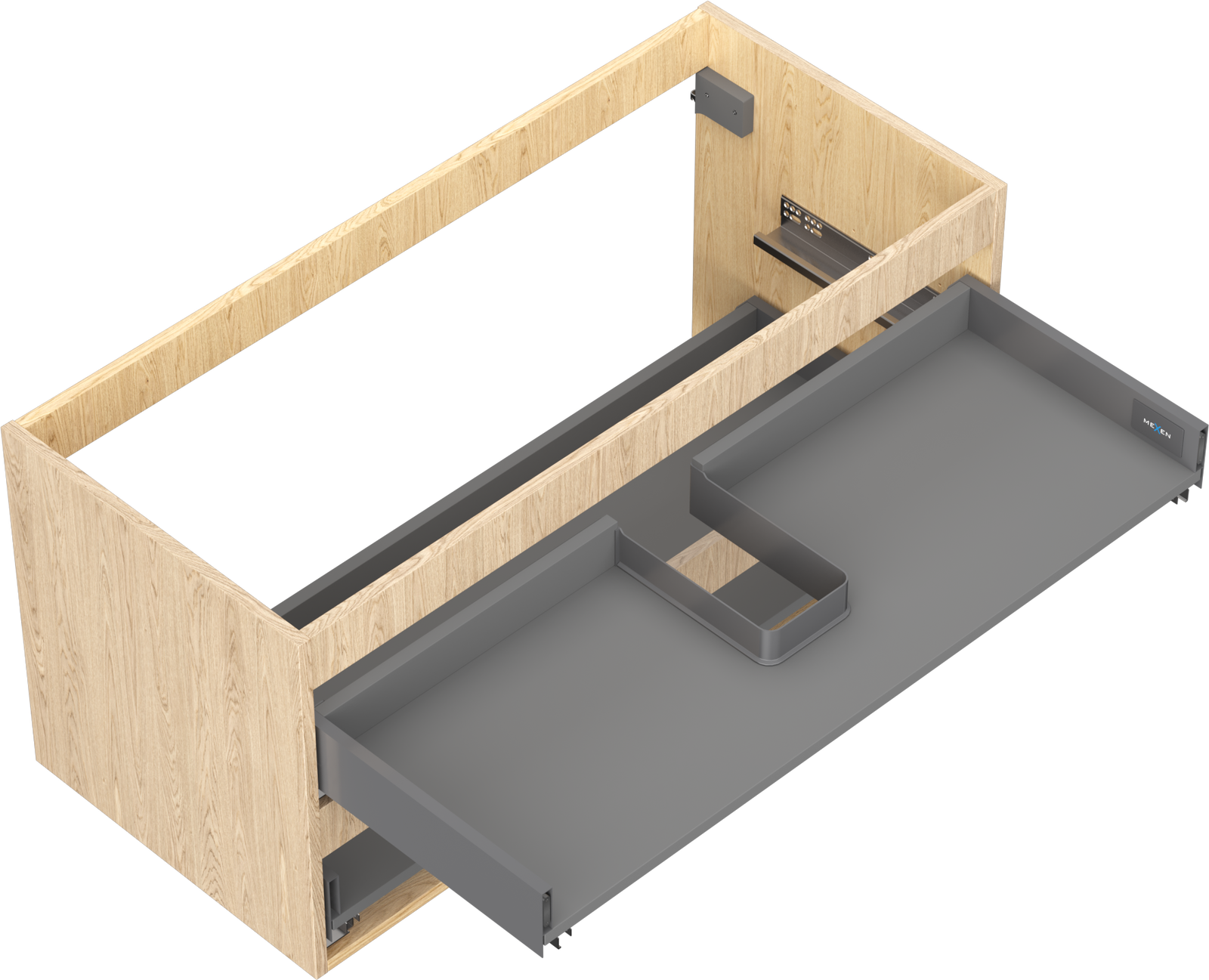 De uitsparing in de lade is zo ontworpen dat het de sifon kan bevatten, die noodzakelijk is in wastafelinstallaties. Hierdoor kan het meubel volledig functioneel worden gemonteerd, zonder dat er ruimte in de lade opgeofferd hoeft te worden voor installatiedoeleinden.