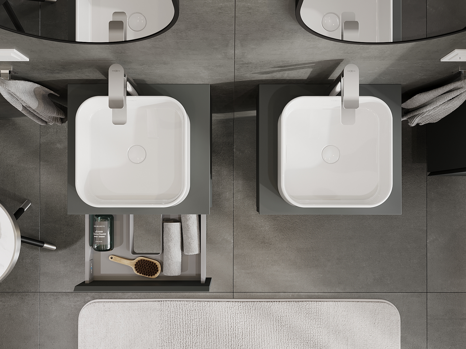 Onze modulaire badkamermeubels kunnen in verschillende kleurconfiguraties met elkaar worden gecombineerd, wat volledige personalisatie mogelijk maakt. Zowel het uiterlijk als de functies van de afzonderlijke elementen kunnen worden gekozen, waardoor de meubels kunnen worden aangepast aan persoonlijke stijlvoorkeuren en gebruikswensen.