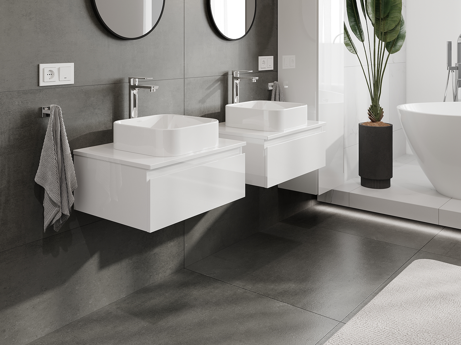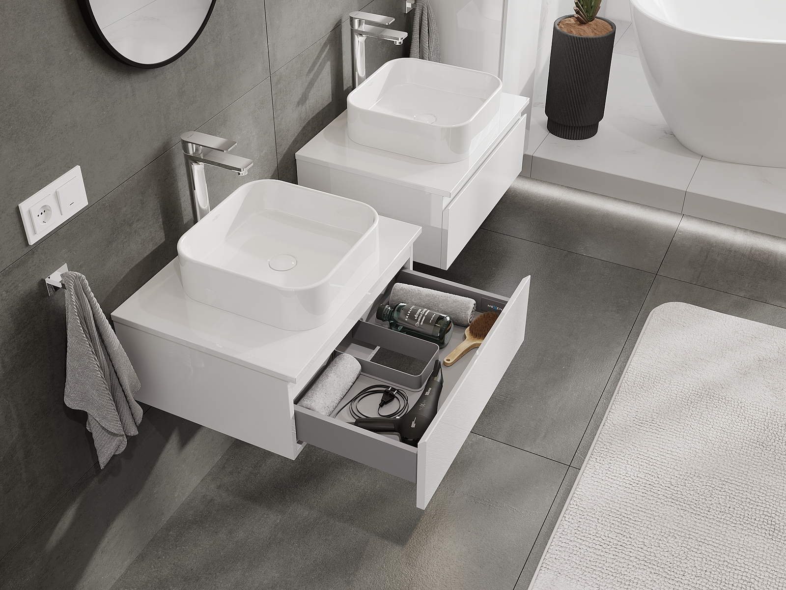Onze modulaire badkamermeubels kunnen in verschillende kleurconfiguraties met elkaar worden gecombineerd, wat volledige personalisatie mogelijk maakt. Zowel het uiterlijk als de functies van de afzonderlijke elementen kunnen worden gekozen, waardoor de meubels kunnen worden aangepast aan persoonlijke stijlvoorkeuren en gebruikswensen.