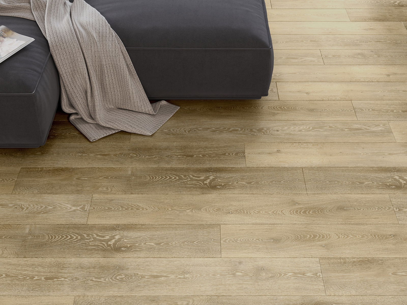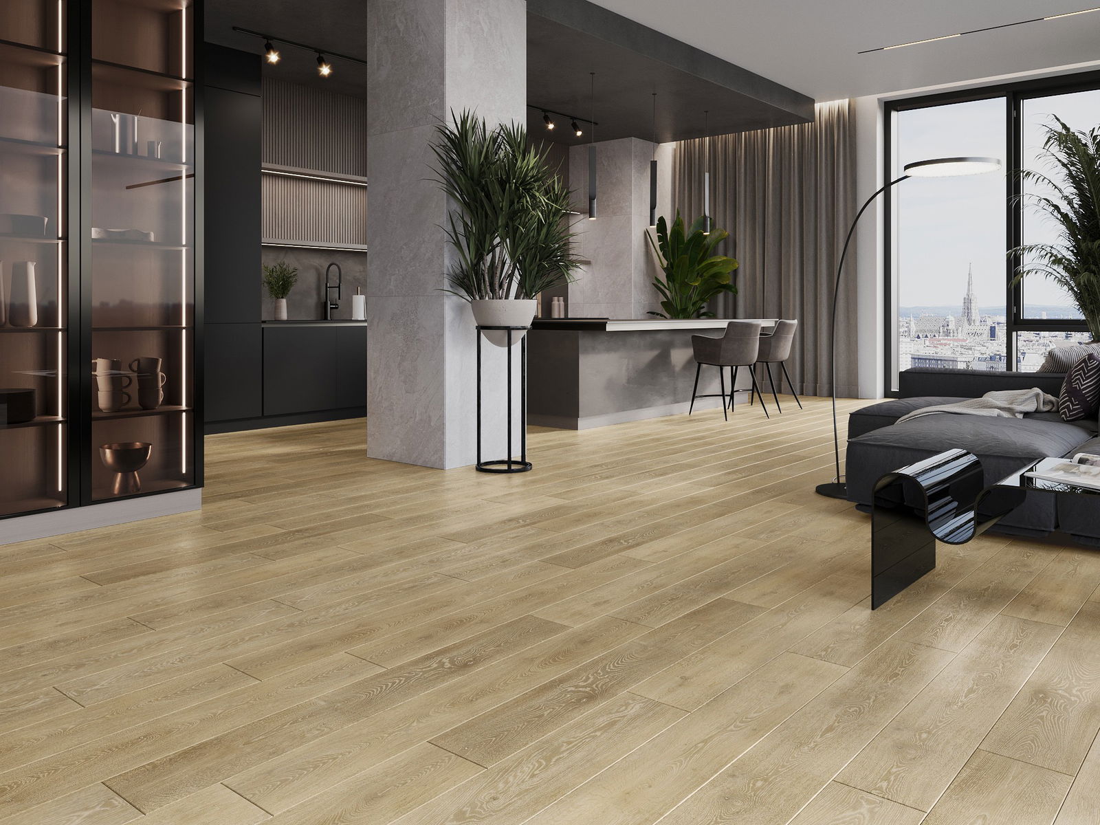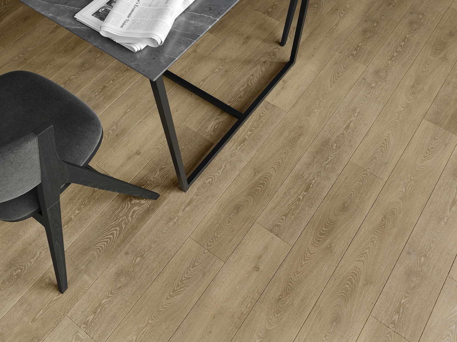 De panelen hebben een vierzijdige afschuining – elke zijde is na installatie gefreesd om een V-vormige voeg te creëren. Dit ontwerp geeft de vloer een uitgesprokener structuur, diepte en esthetisch karakter. Dit effect komt vooral tot zijn recht in moderne interieurs, waar details de unieke uitstraling van het interieur benadrukken.