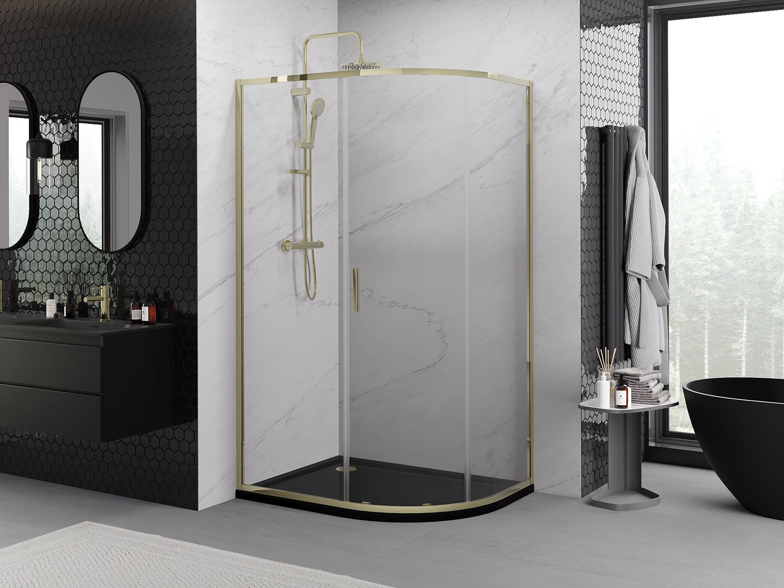 Mexen Exo asymmetrische halfronde schuifdouchecabine 120 x 90 cm, transparant, goud - 8131-120-090-50-00