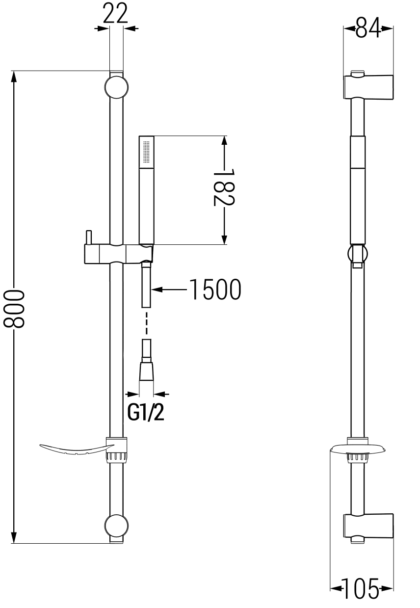 Hoogte van de handdouche: 182 mm