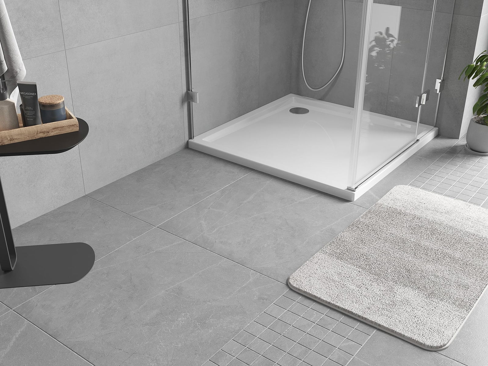 De douchebak heeft een lage drempel, wat het in- en uitstappen uit de douche vergemakkelijkt. Het voegt een uitzonderlijke en tijdloze afwerking toe aan de ruimte, waardoor de badkamer een comfortabele en esthetische plek wordt voor dagelijkse ontspanning.