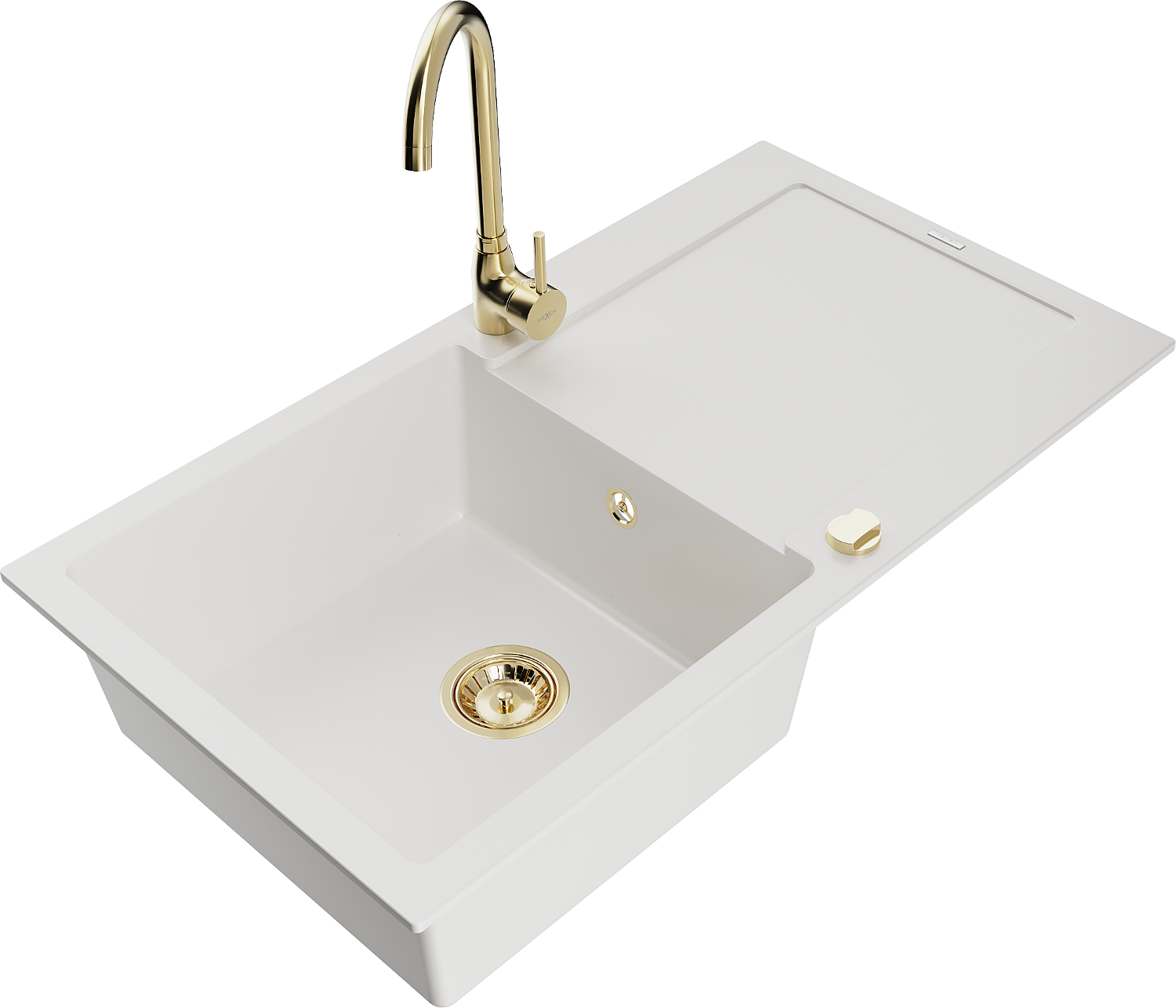 Mexen Leo granieten gootsteen 1-komors met afdruiprek en keukenkraan Telma, wit - 6501-20-670200-50