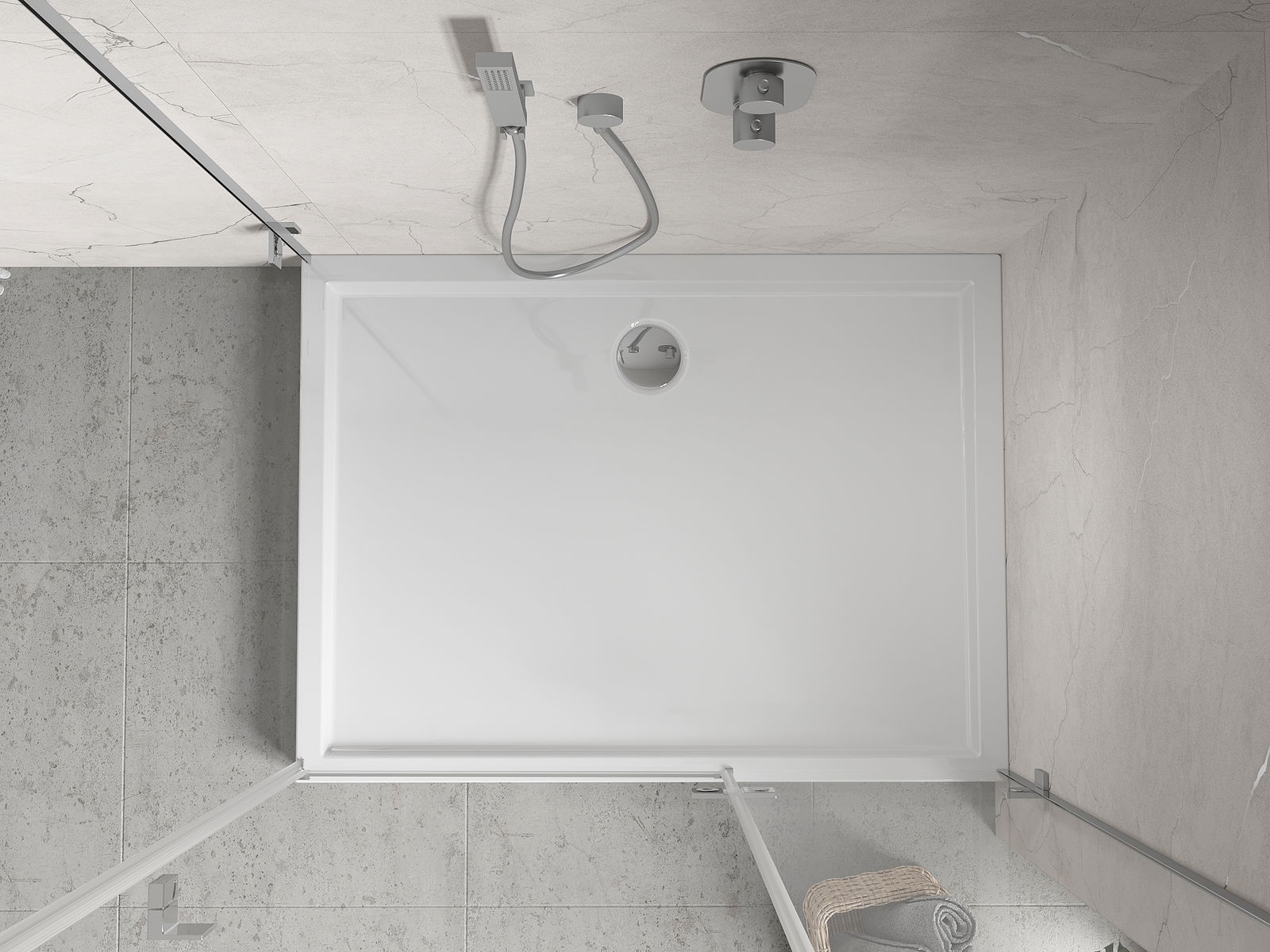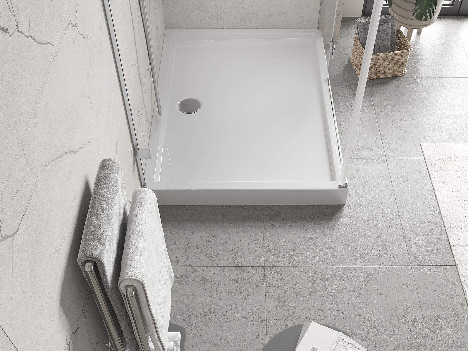 De douchebak is zo ontworpen dat het water vrij kan weglopen in de richting van de afvoer. Het zorgt voor een snelle en efficiënte afvoer van water van het oppervlak van de douchebak, waardoor het ontstaan van plassen en het overstromen van de badkamer wordt voorkomen.