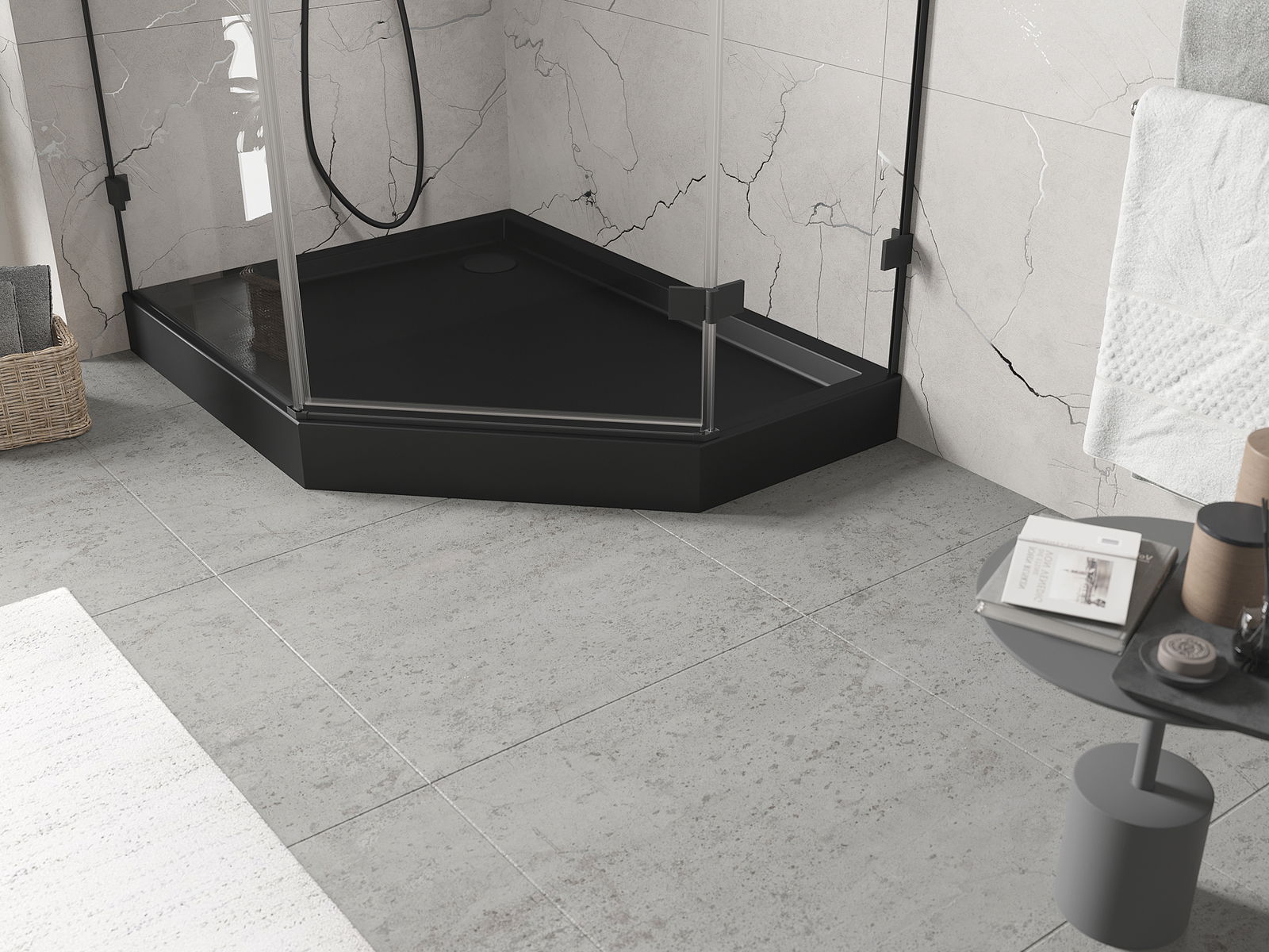 De douchebak is zo ontworpen dat het water vrij kan weglopen in de richting van de afvoer. Het zorgt voor een snelle en efficiënte afvoer van water van het oppervlak van de douchebak, waardoor het ontstaan van plassen en het overstromen van de badkamer wordt voorkomen.