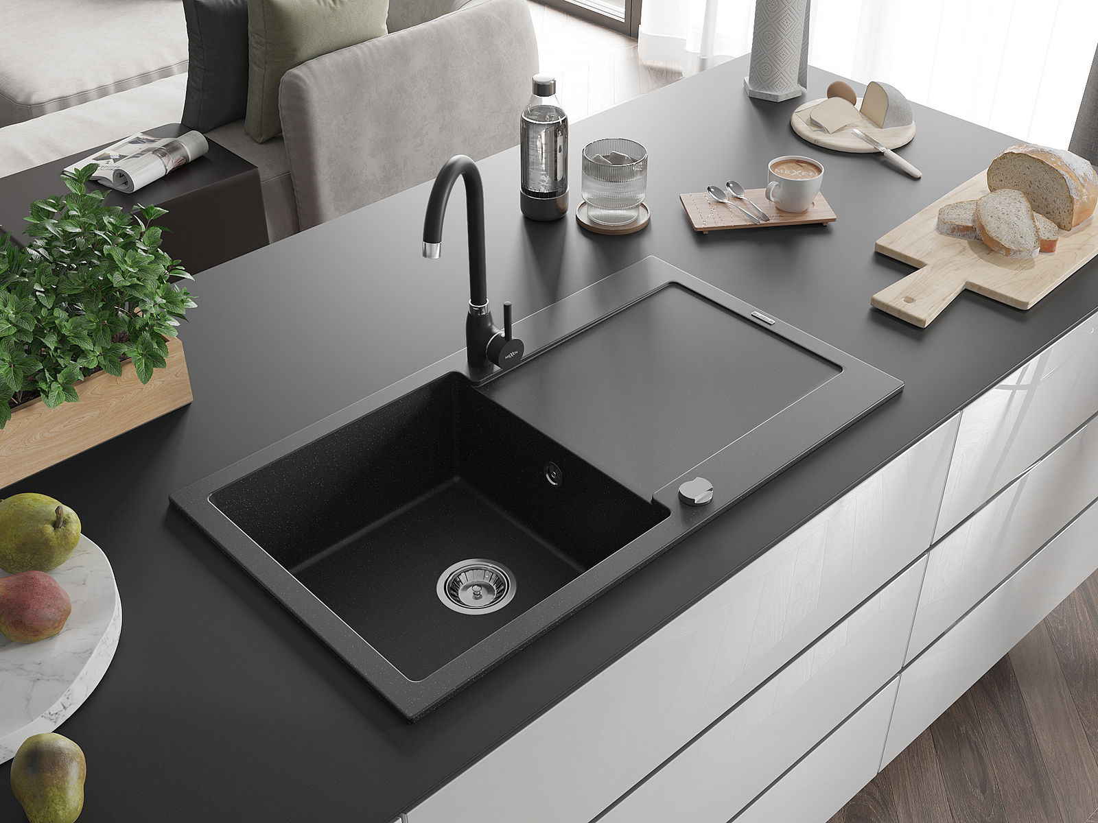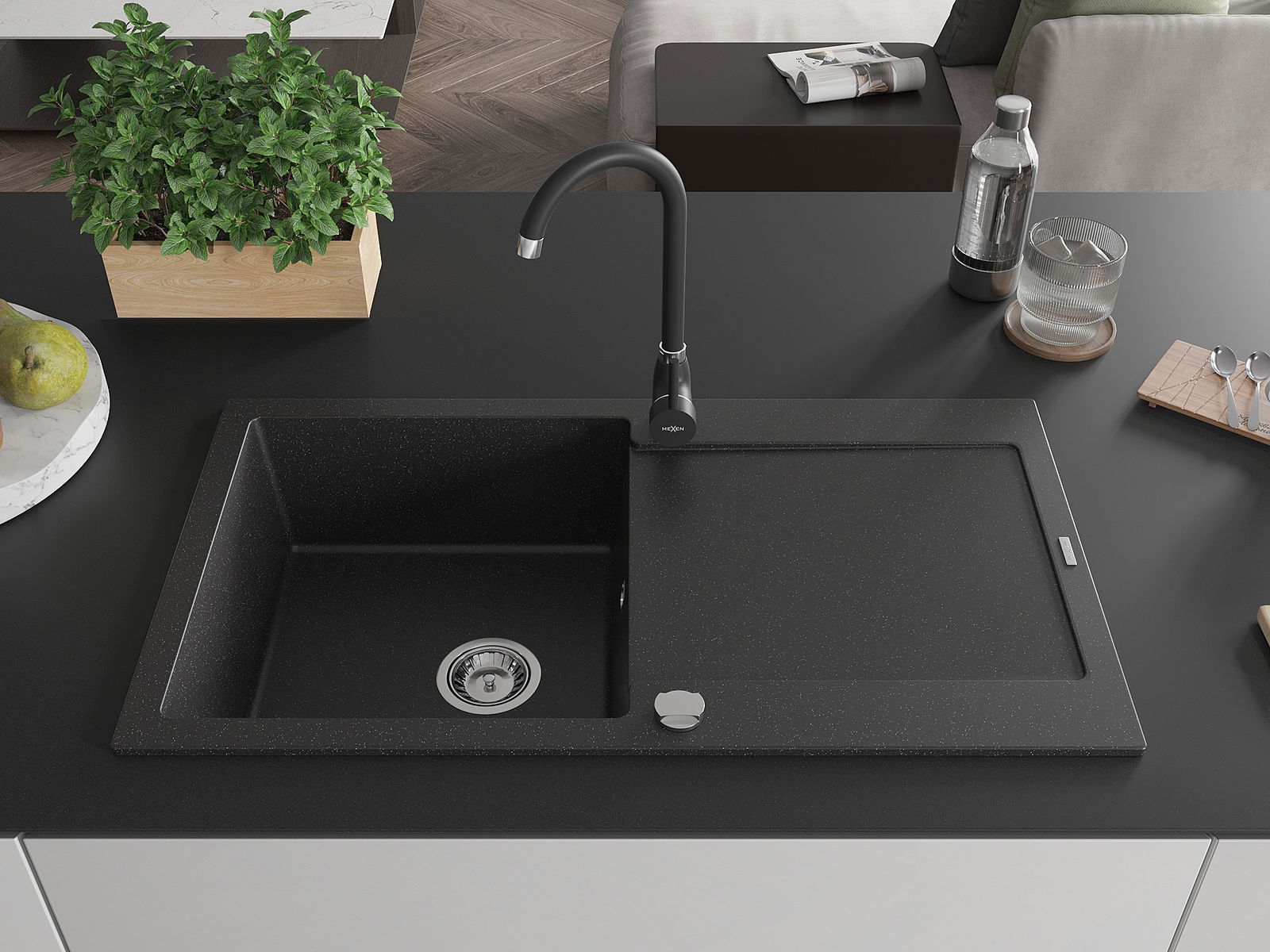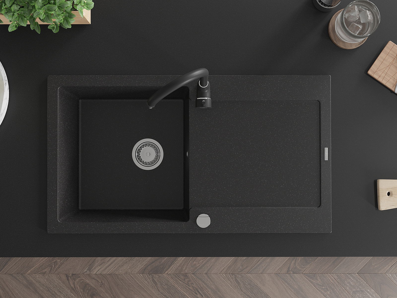Mexen Leo granieten spoelbak 1-komers met afdruiprek en keukenmengkraan Telma, zwart/zilveren metallic - 6501-73-670200-70