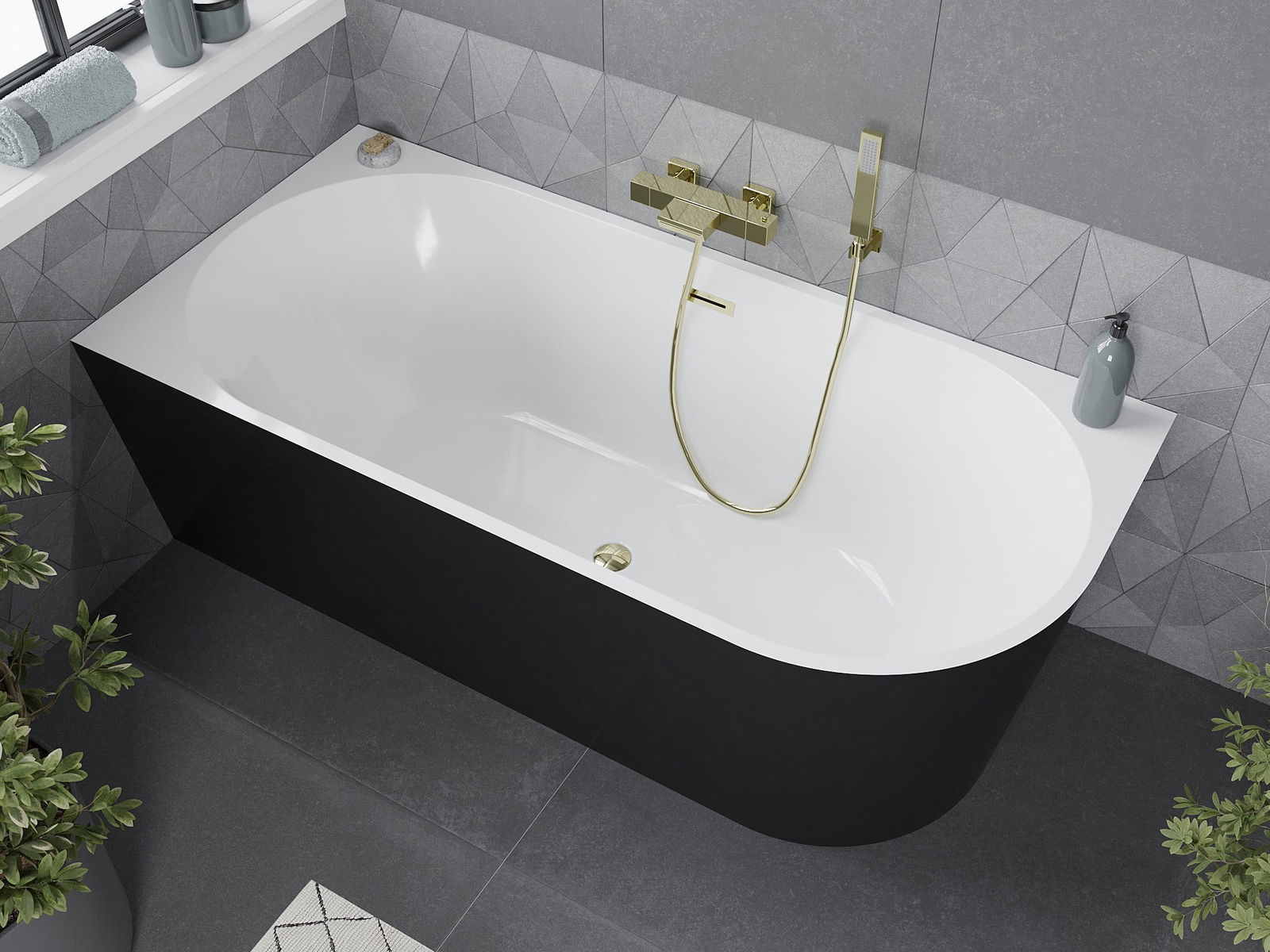 Mexen Mia vrijstaande hoekbad links 140 x 75 cm, wit/zwart, overloop goud - 52691407575L-50