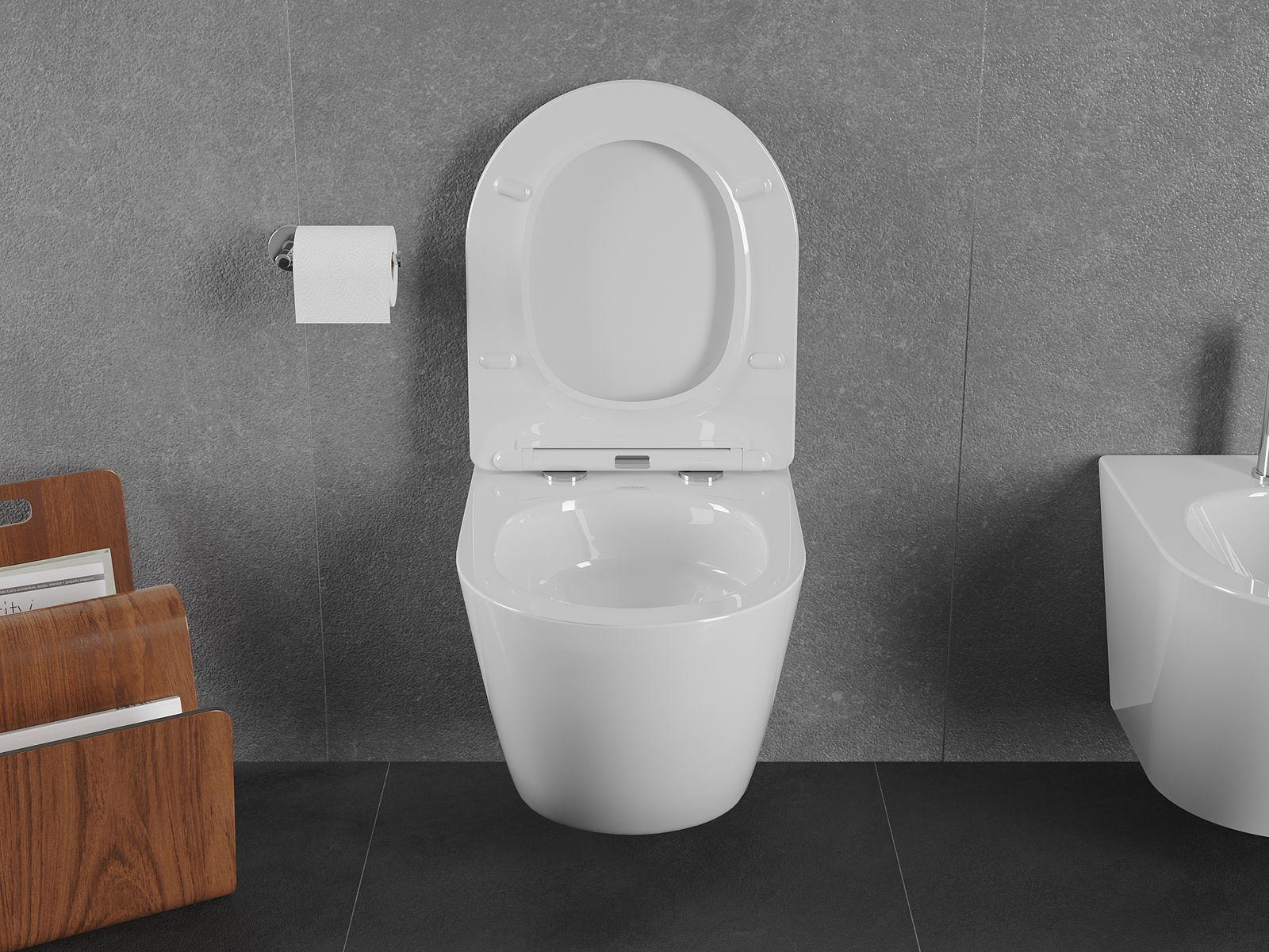 De zelfsluitende toiletbril is uitgerust met een speciaal systeem dat het snelle en plotselinge vallen ervan remt. Het systeem elimineert effectief het probleem van klapperen met de bril en minimaliseert geluid, waardoor een soepele en stille sluiting van het toilet wordt gegarandeerd.