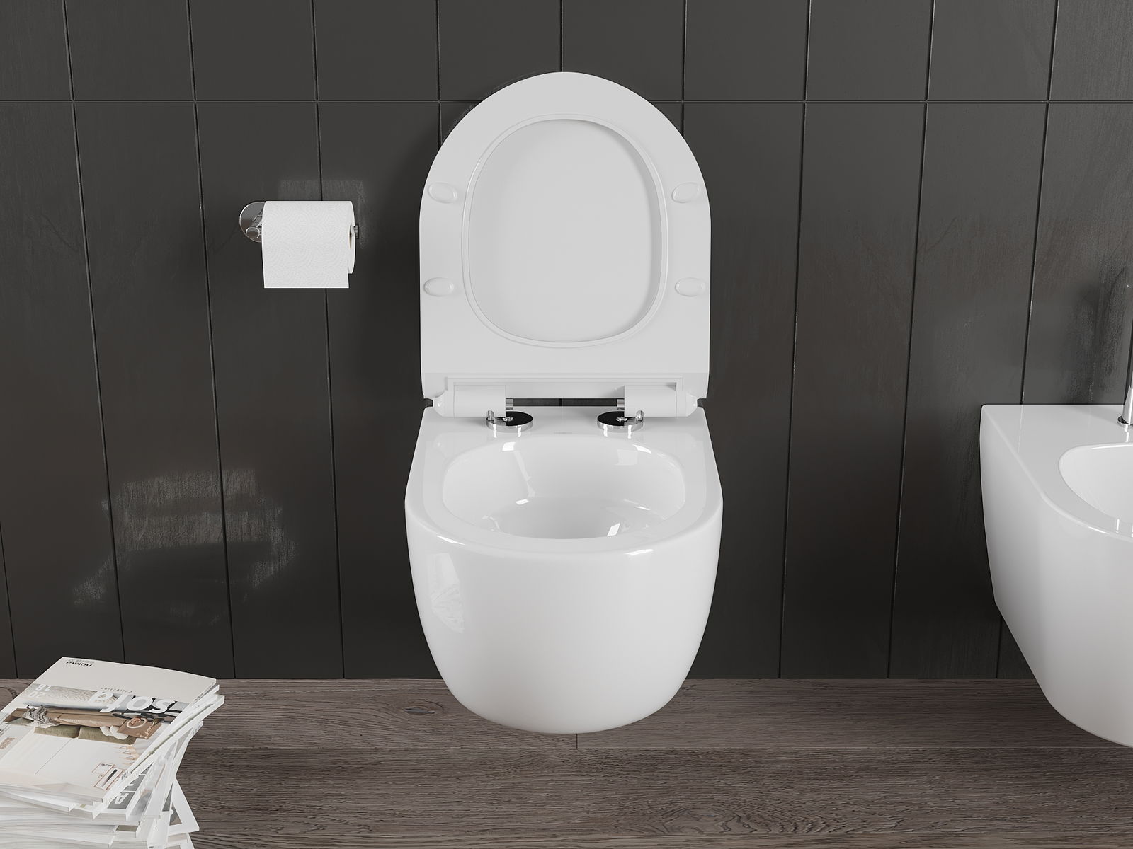 De zelfsluitende toiletbril is uitgerust met een speciaal systeem dat het snelle en plotselinge vallen ervan remt. Het systeem elimineert effectief het probleem van klapperen met de bril en minimaliseert geluid, waardoor een soepele en stille sluiting van het toilet wordt gegarandeerd.