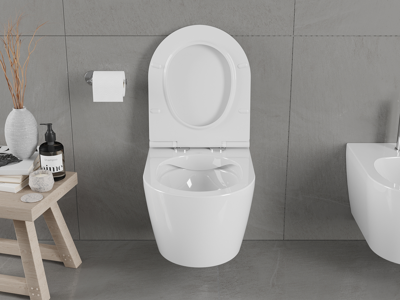 Mexen Carmen is een moderne wc-pot die opvalt door de Rimless spoeltechnologie, die zorgt voor meer hygiëne en eenvoudiger onderhoud. Hangende installatie bespaart ruimte in de badkamer. Het product is gemaakt van duurzaam sanitair keramiek in glanzend wit, wat zijn elegante uitstraling benadrukt. De dunne zitting met langzaam sluitend mechanisme en metalen scharnieren van duroplast verhoogt het gebruikscomfort. Dit model biedt praktische oplossingen zoals eenvoudig uitneembaar.