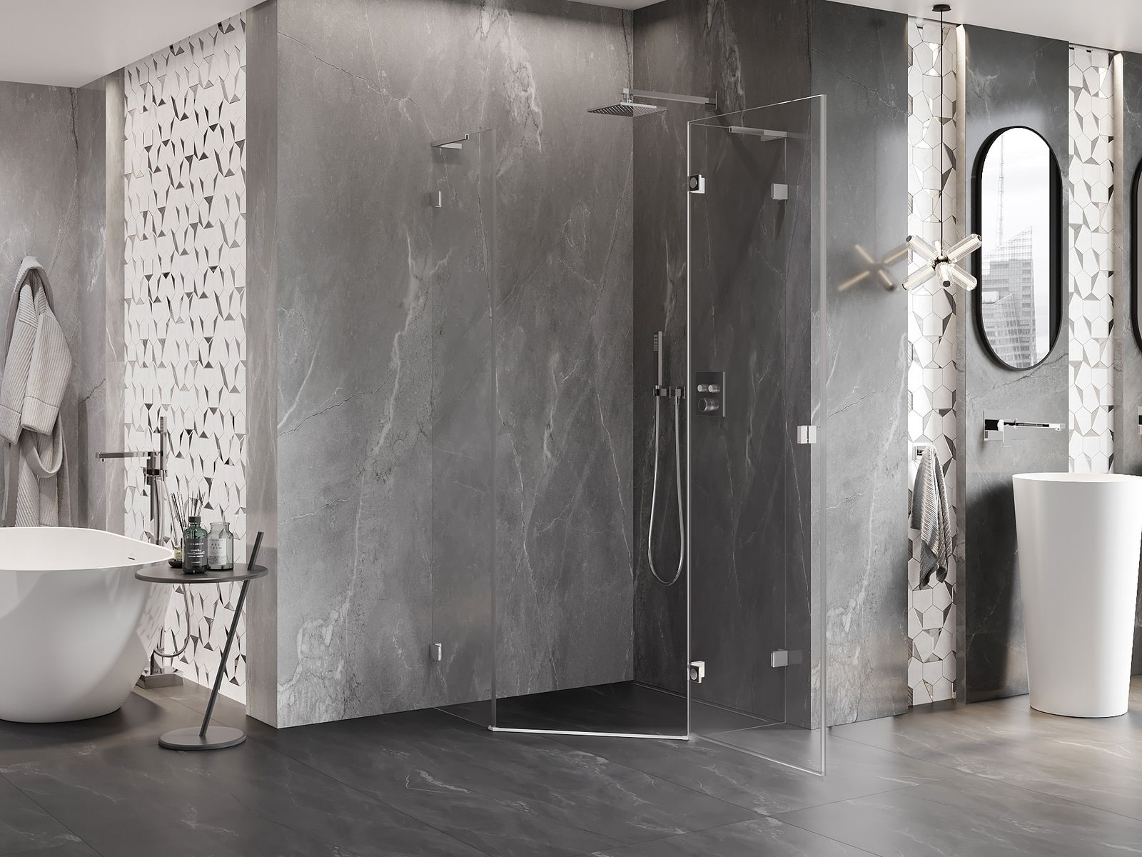 Draaideuren bieden maximale vrijheid tijdens het gebruik. Ze hebben stevige scharnieren gemaakt van duurzaam materiaal, die gemakkelijk schoon te houden zijn en zorgen voor gemakkelijke toegang tot het interieur van de cabine.