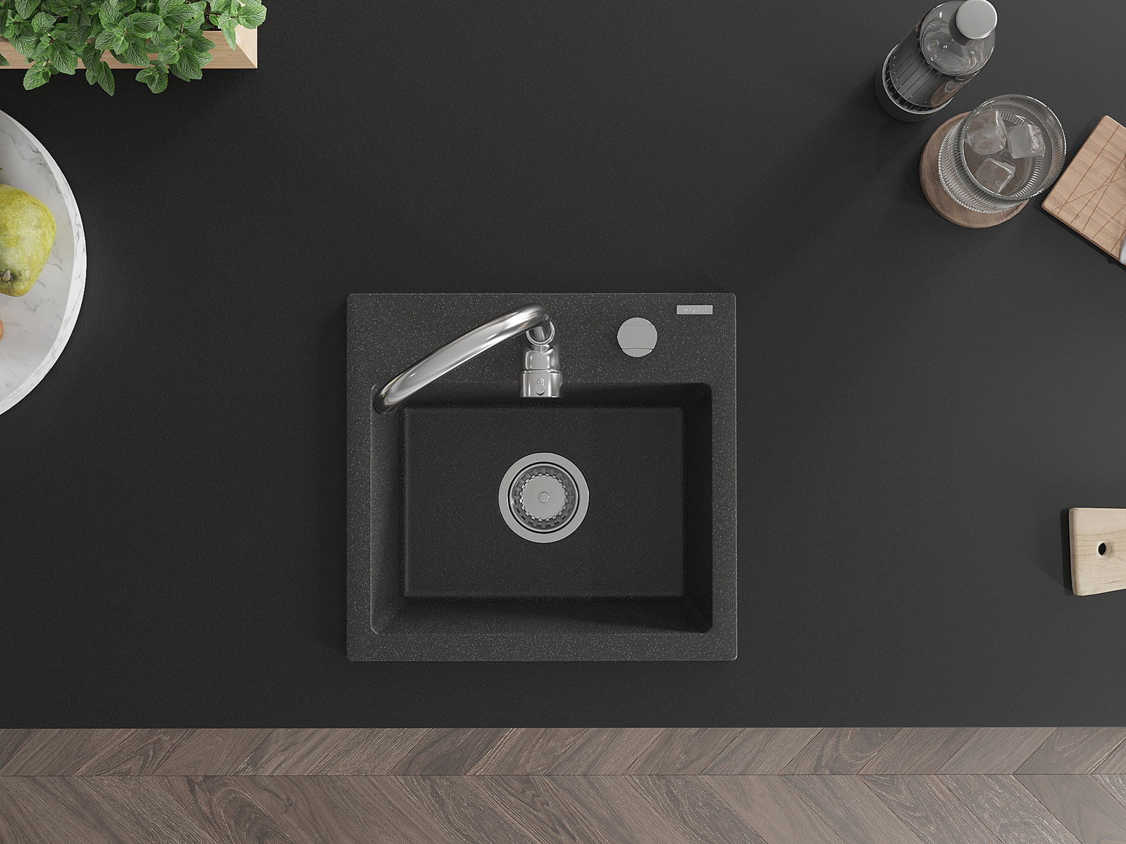 De spoelbak heeft een voorgesneden gat met een diameter van 35 mm voor eenvoudige verwijdering. Dit gat kan bijvoorbeeld worden gebruikt om een vloeistofdispenser te installeren, waardoor plastic flessen in de keuken overbodig zijn en een elegante afwerking ontstaat.