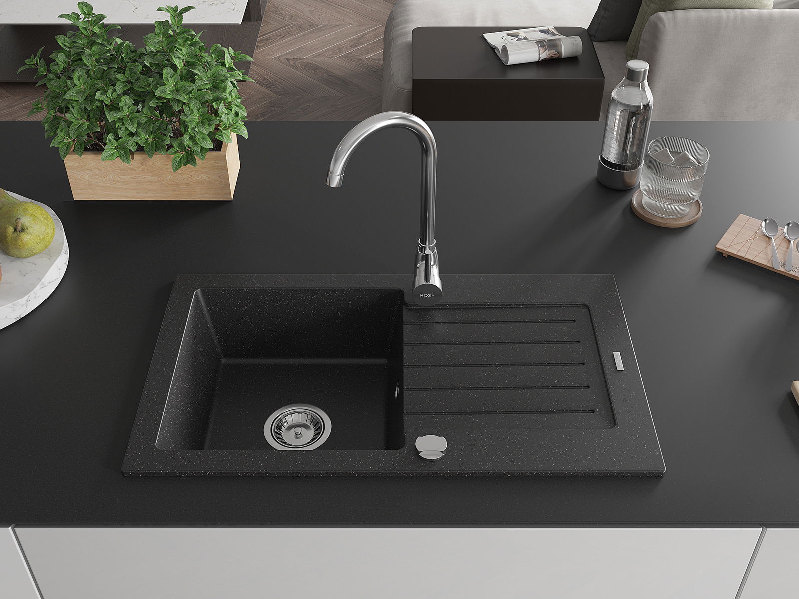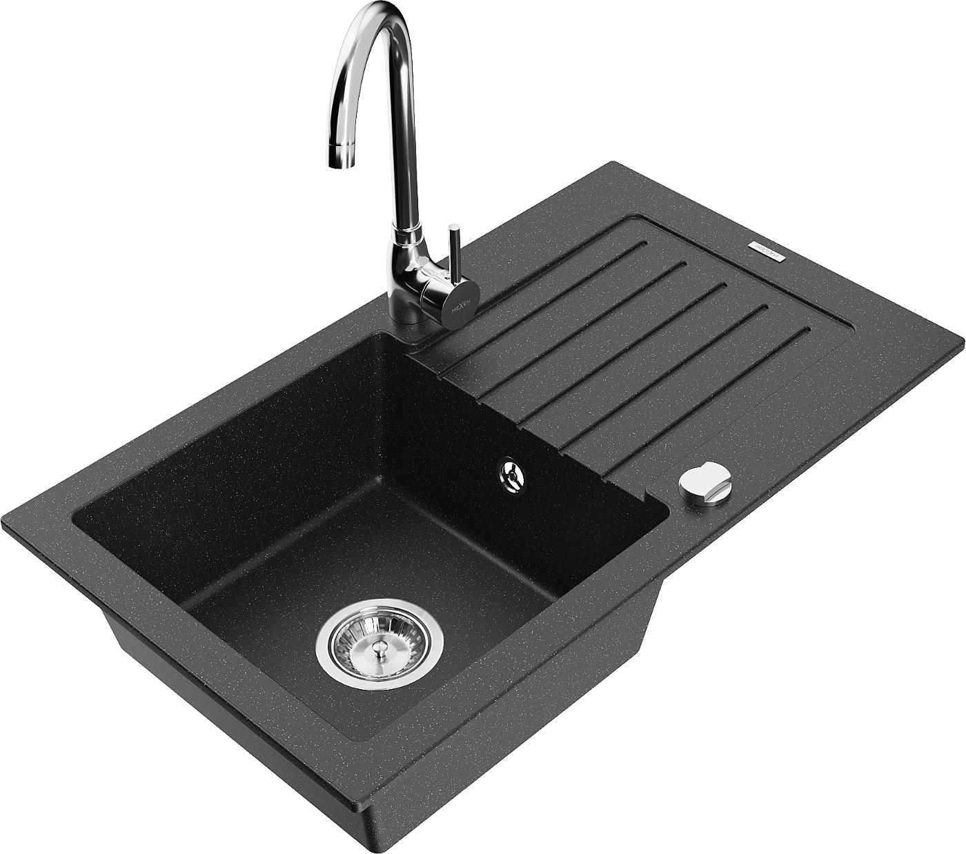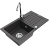 Mexen Pablo granieten gootsteen met 1 kom, afdruiprek en Telma keukenkraan, zwart/zilver - 6510-73-670200-00