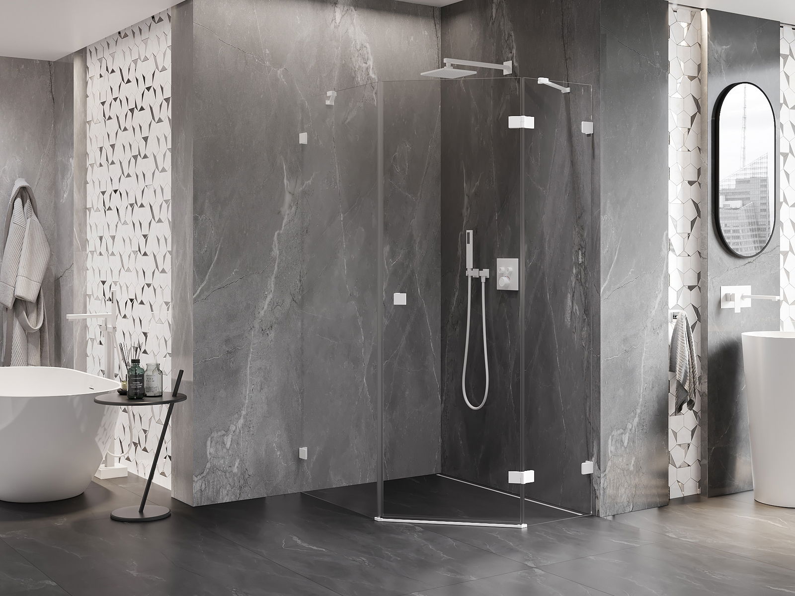 Handige en comfortabele greep is gemaakt van duurzaam en weerbestendig metaal. De modieuze vorm in combinatie met een afwerking die past bij de kleur van de profielen geeft het geheel een moderne en stijlvolle uitstraling, wat de esthetiek van elke badkamer benadrukt.
