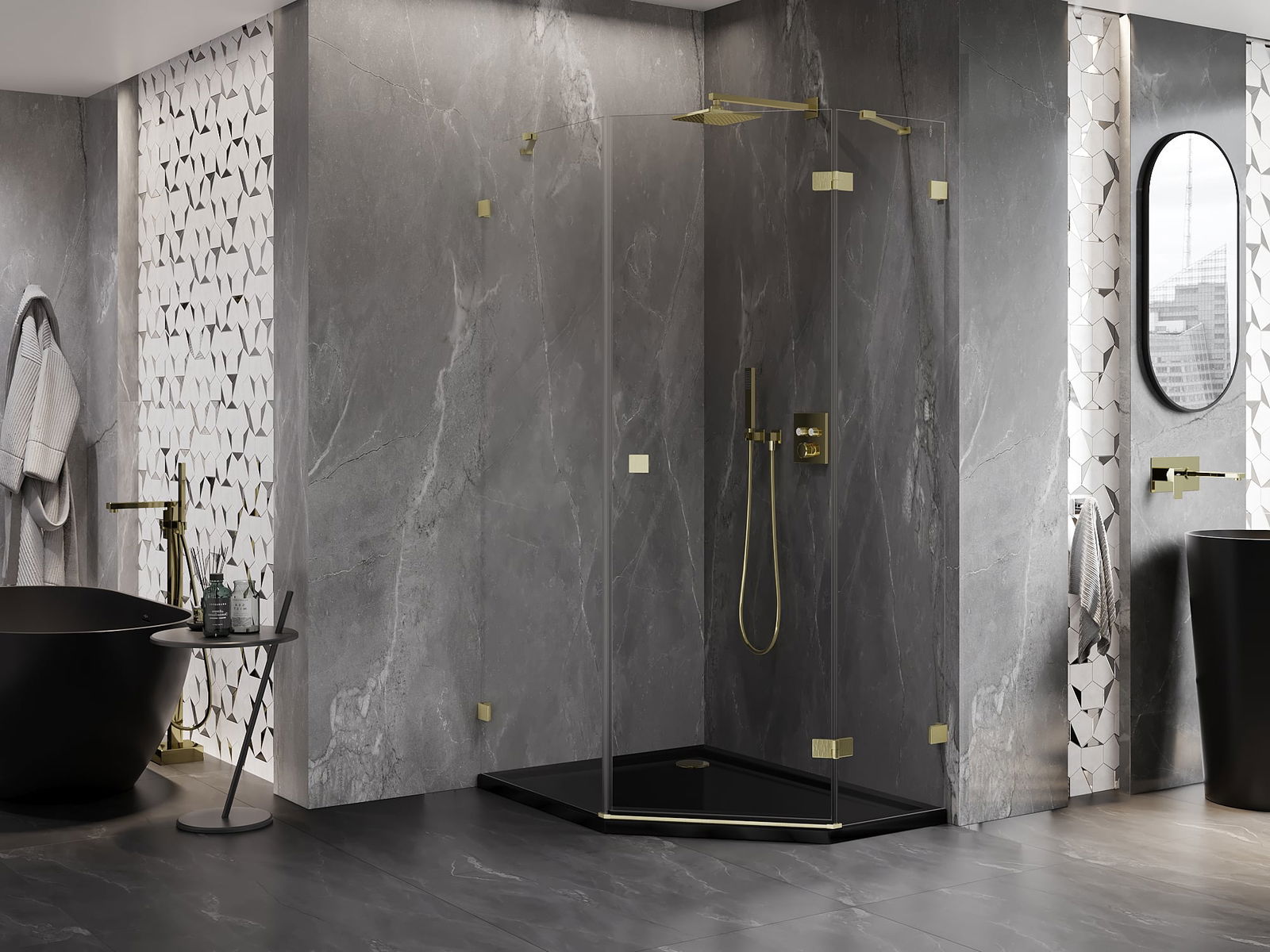 Mexen Lunar vijfhoekige douchecabine scharnierend rechts 80 x 100 cm, transparant, goud geborsteld - 831-080P-100L-55-00-P