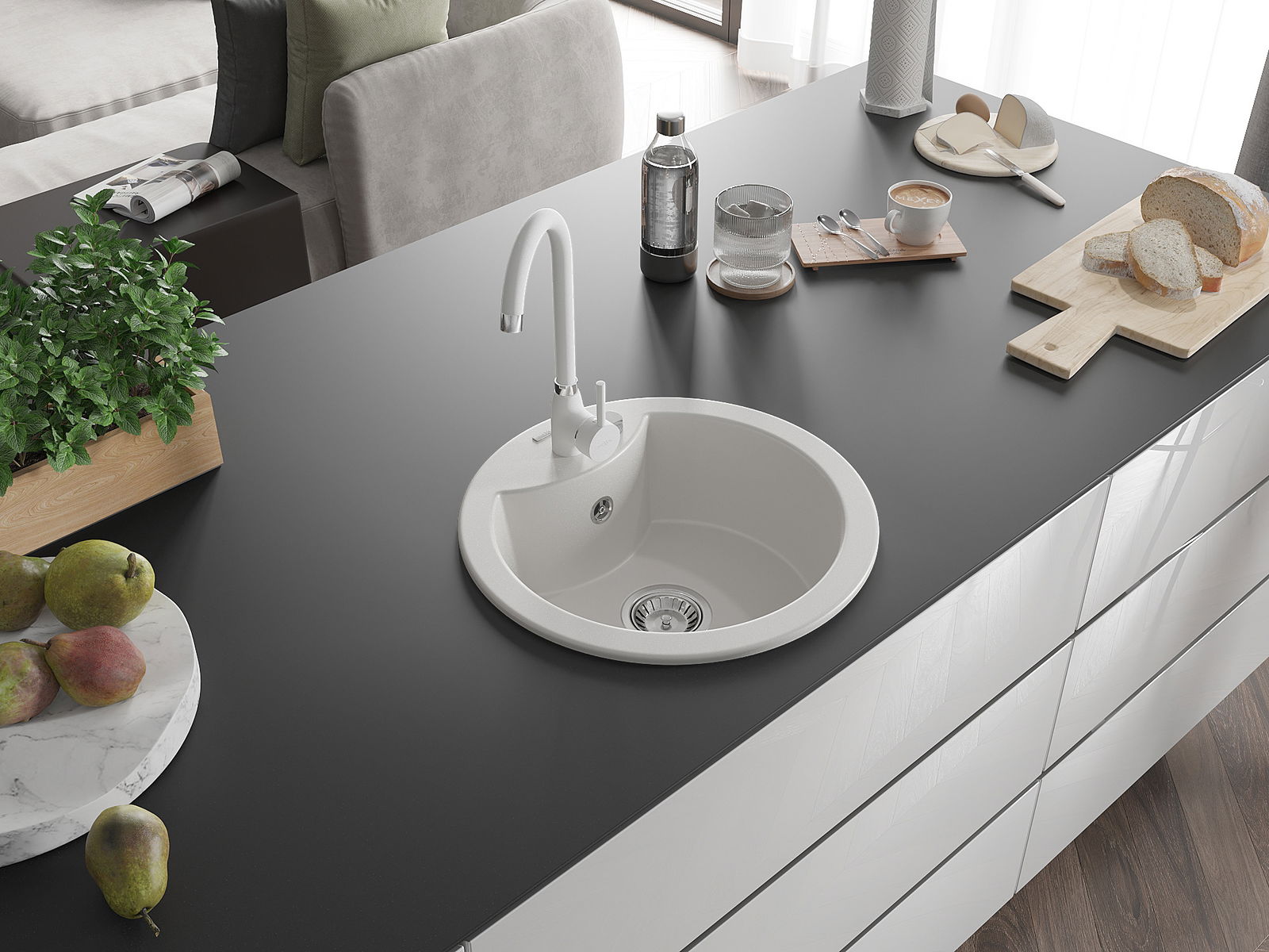 Mexen Diego granieten 1-kompartment gootsteen met Telma keukenmengkraan, wit - 6512-20-670200-20