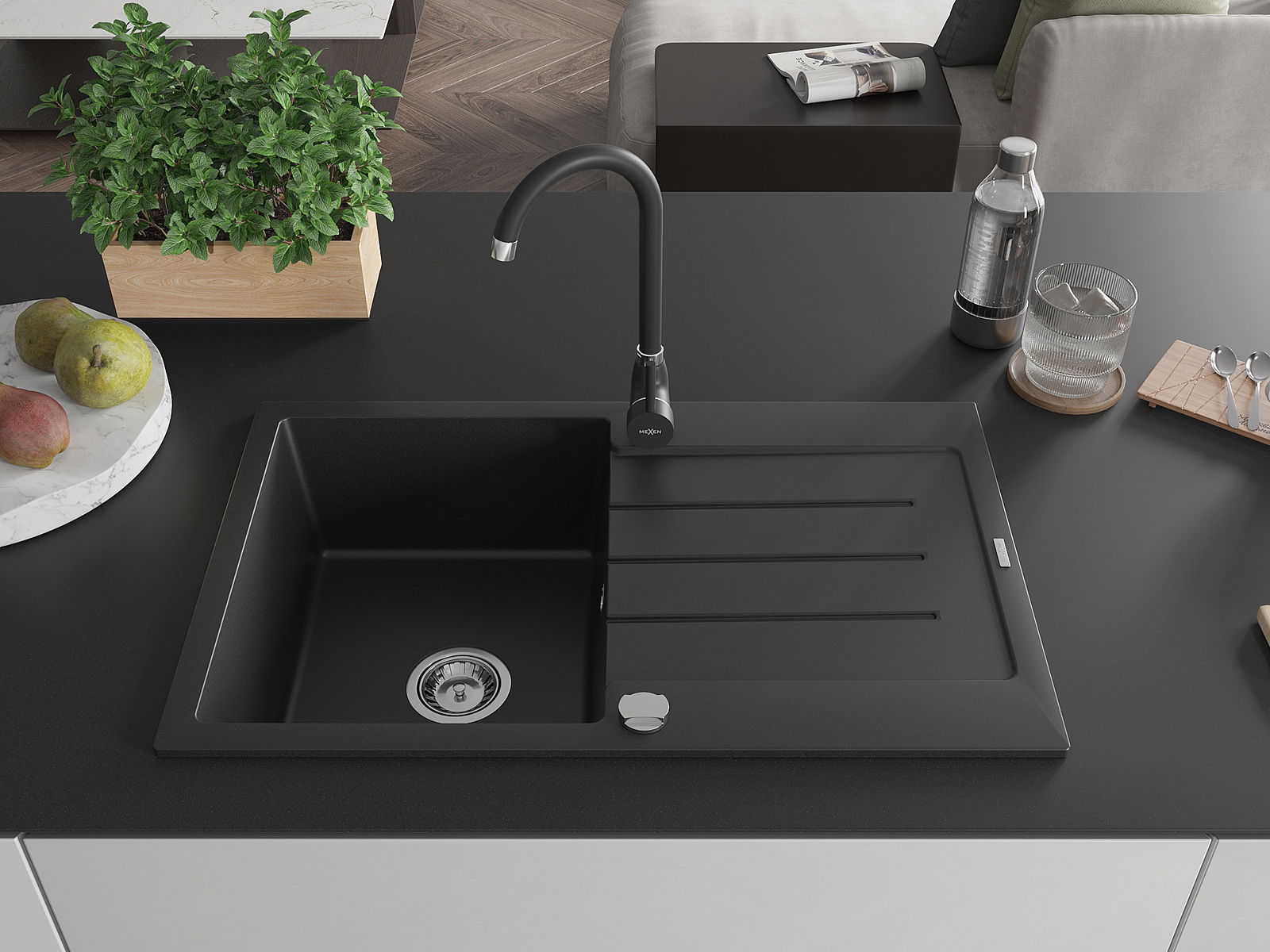 Mexen Bruno granieten spoelbak 1-komers met afdruiprek en Telma keukenkraan, zwart - 6513-77-670200-70