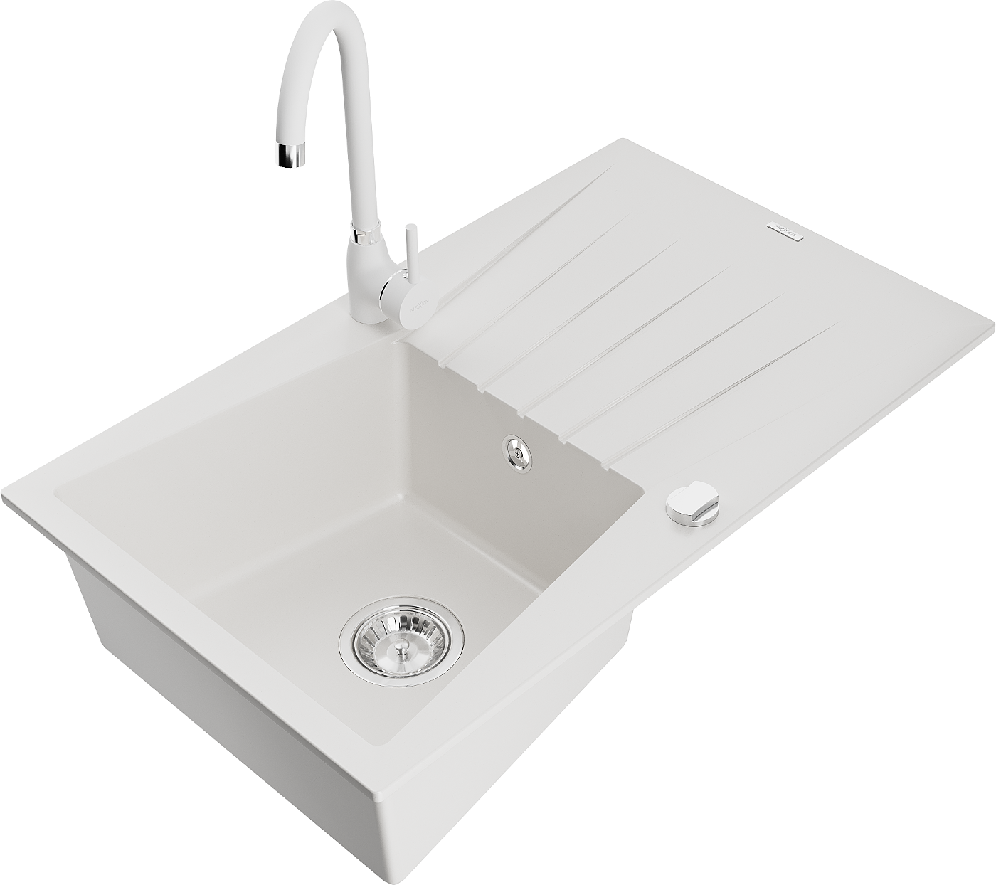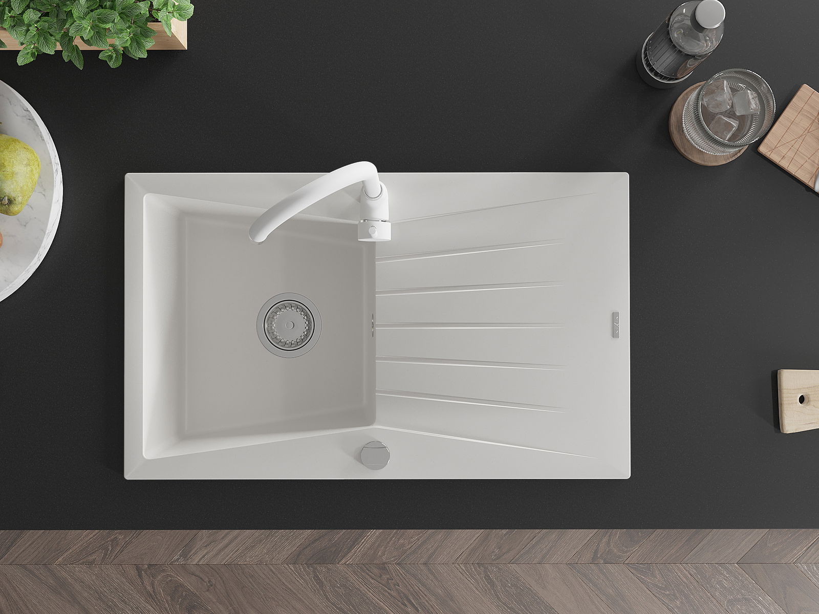 Mexen Cesar granieten spoelbak met 1 bak, afdruiprek en keukenmengkraan Telma, wit - 6514-20-670200-20
