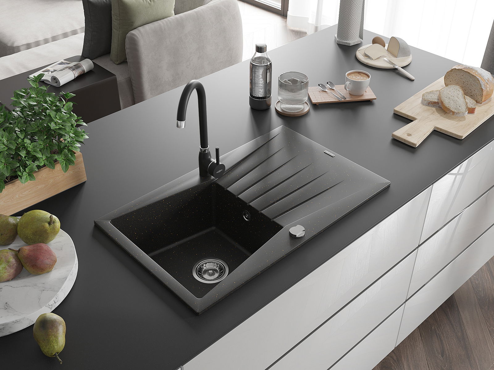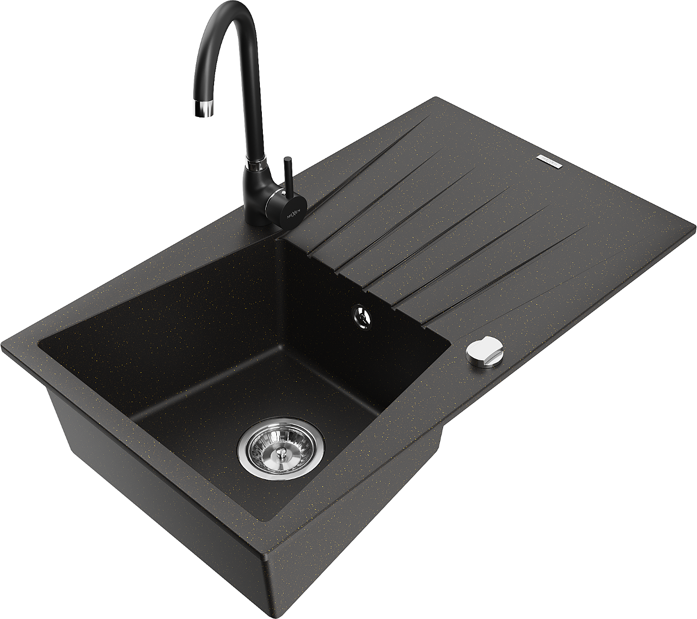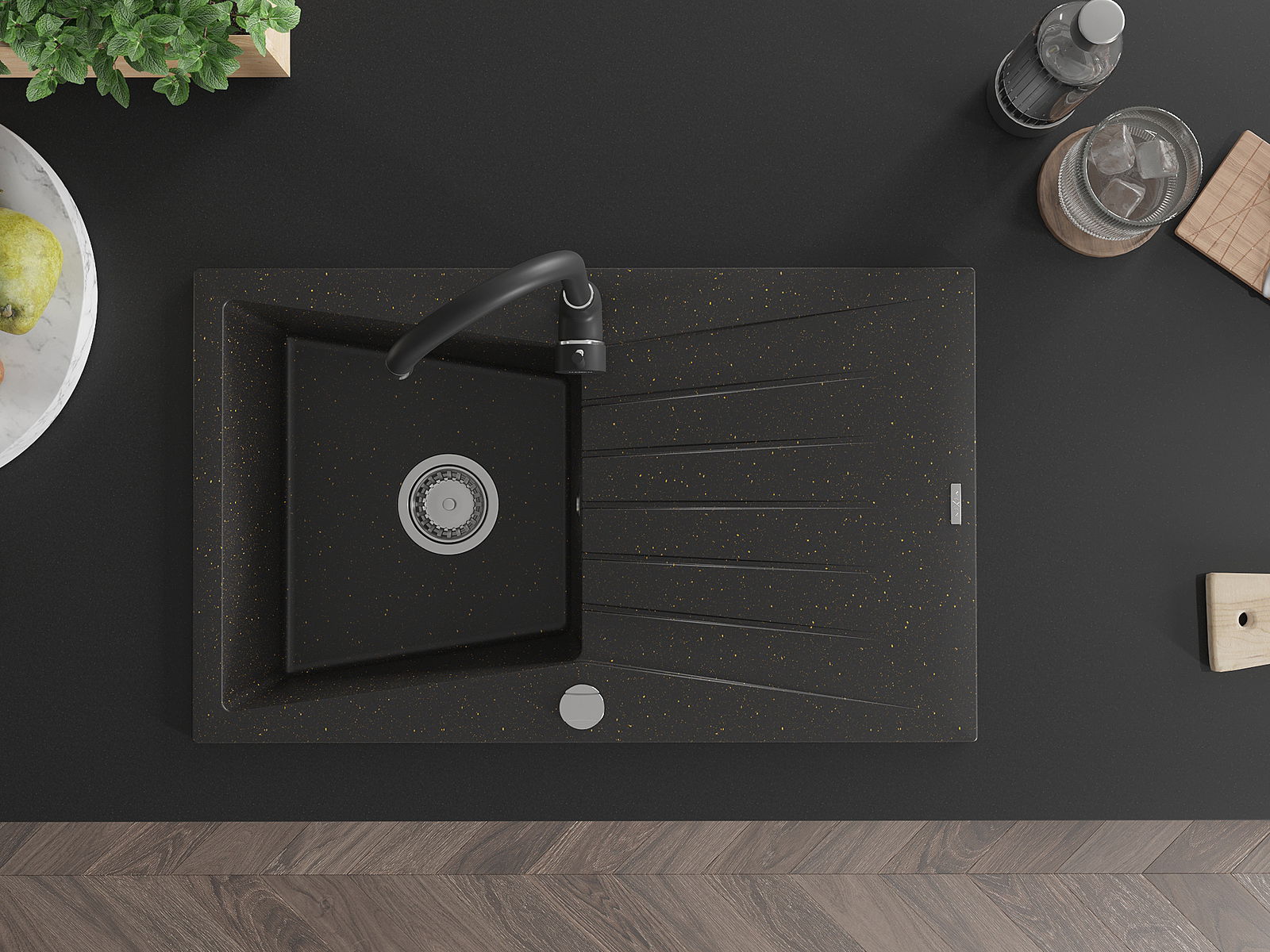 Mexen Cesar granieten spoelbak met 1 bak en afdruiprek en Telma keukenkraan, zwart/goud - 6514-75-670200-70
