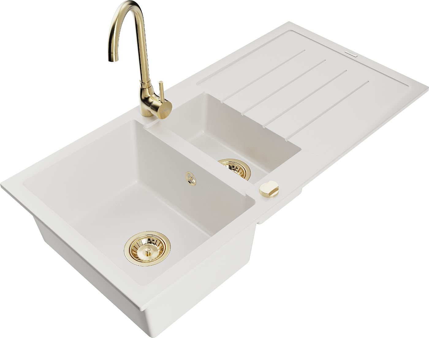 Mexen Andres granieten spoelbak 1,5-komor met afdruiprek en keukenkraan Telma, wit - 6515-20-670200-50