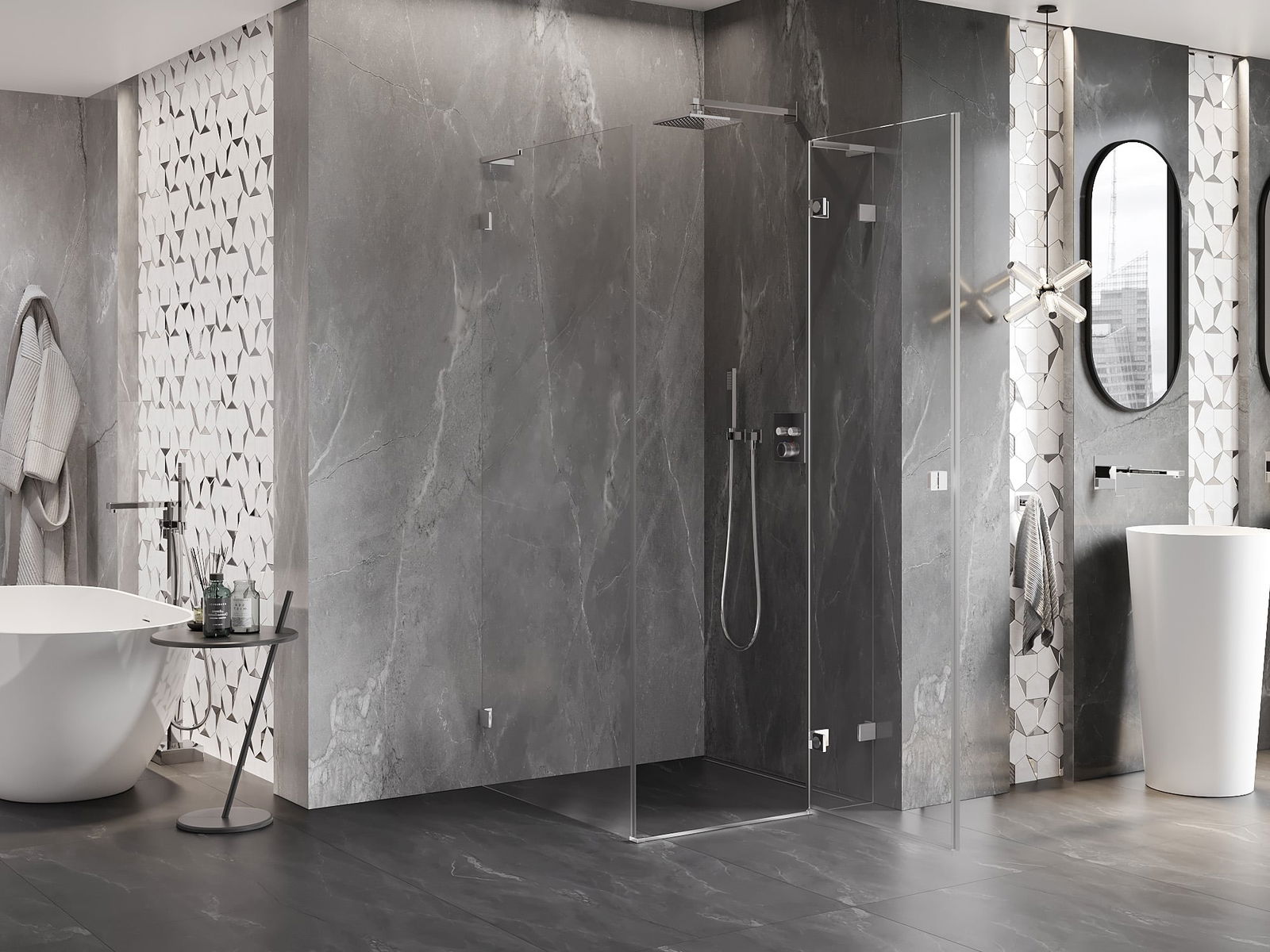 Handige en comfortabele greep is gemaakt van duurzaam en weerbestendig metaal. De modieuze vorm in combinatie met een afwerking die past bij de kleur van de profielen geeft het geheel een moderne en stijlvolle uitstraling, wat de esthetiek van elke badkamer benadrukt.
