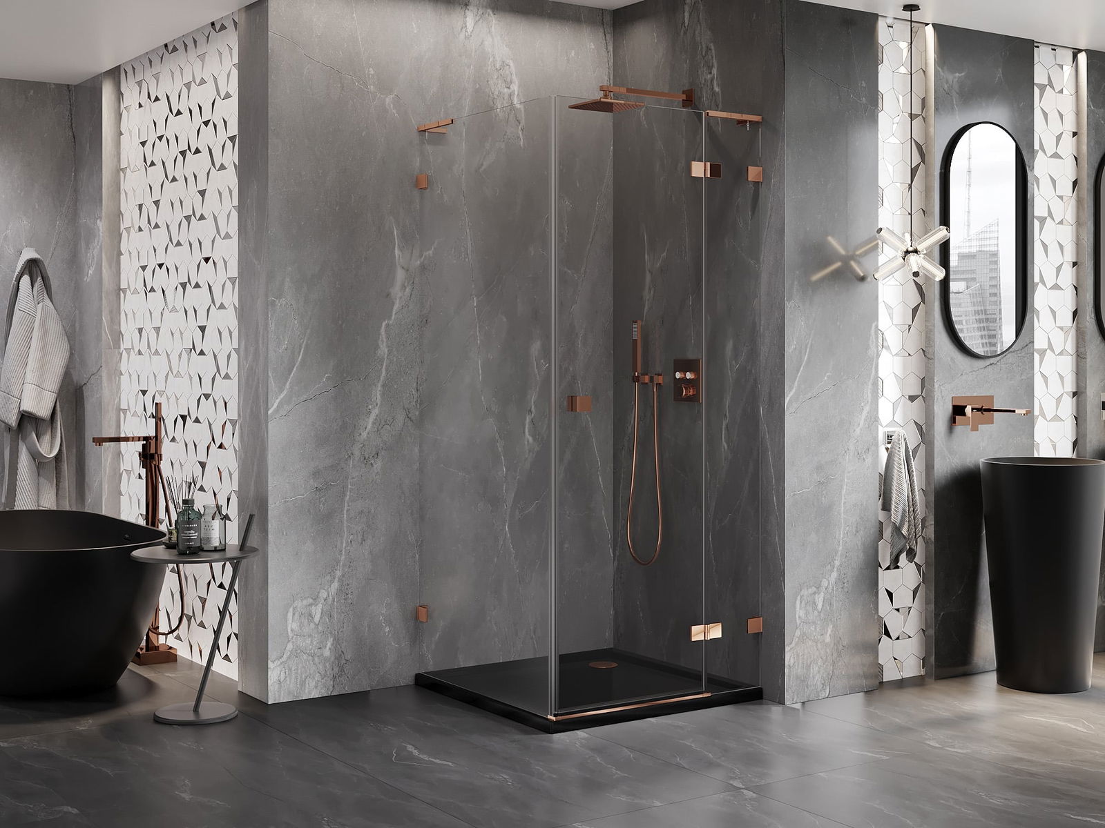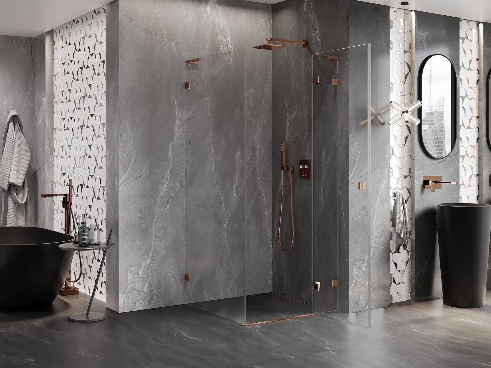 Handige en comfortabele greep is gemaakt van duurzaam en weerbestendig metaal. De modieuze vorm in combinatie met een afwerking die past bij de kleur van de profielen geeft het geheel een moderne en stijlvolle uitstraling, wat de esthetiek van elke badkamer benadrukt.